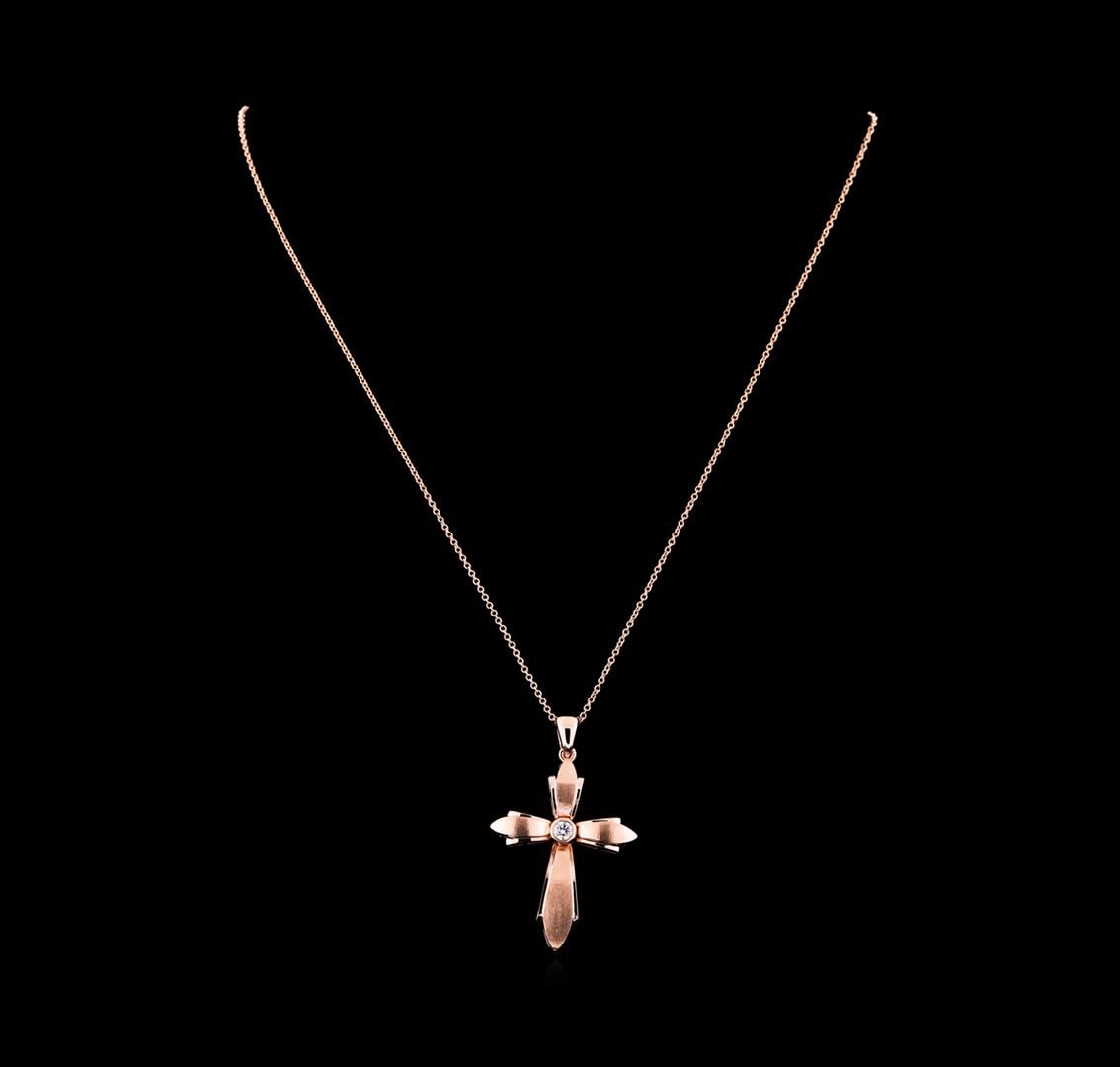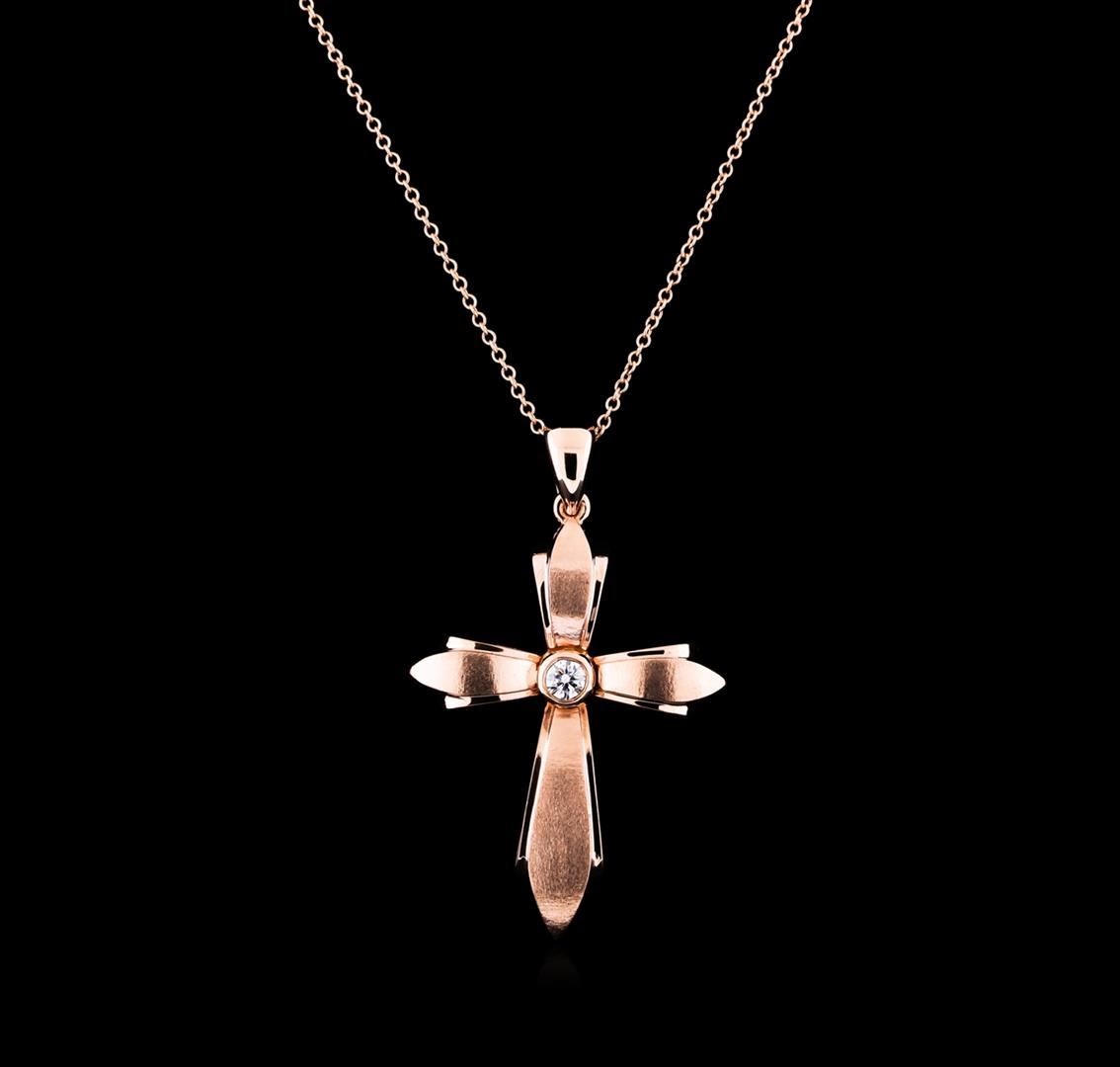One cross pendant with chain featuring: 14KT rose gold weighing 8.22 grams containing one diamond with a total weight of 0.18ct.