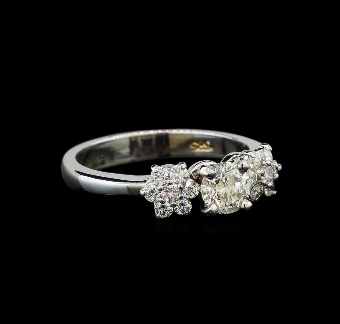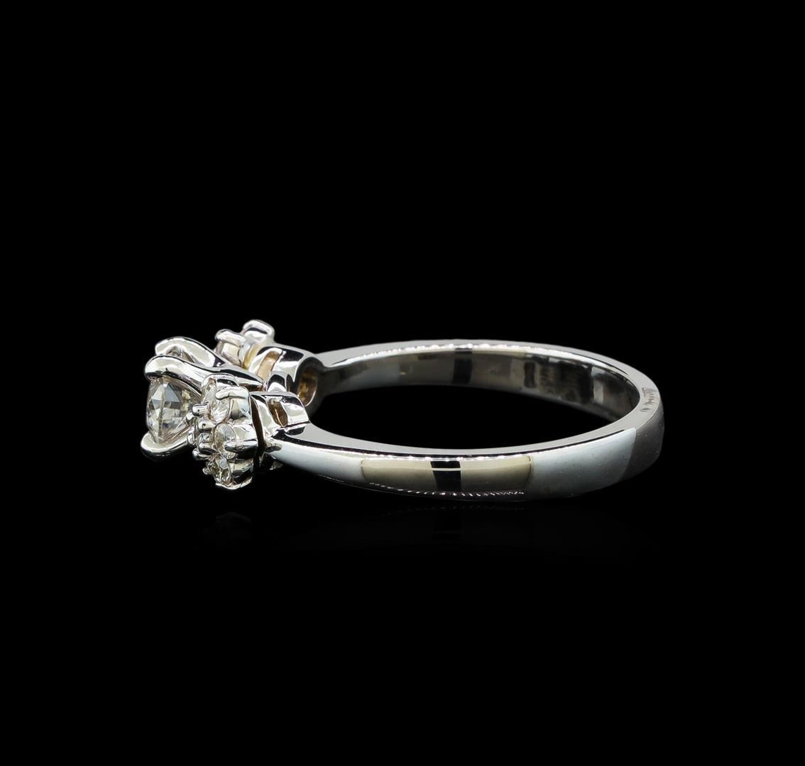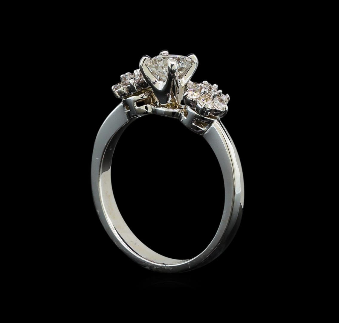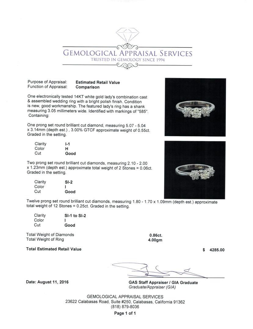 One electronically tested 14KT white gold lady's combination cast & assembled wedding ring with a bright polish finish. The featured lady's ring has a shank measuring 3.05 millimeters wide. Identified with markings of '585'. Condition is new, good workmanship. Containing: One prong set round brilliant cut diamond, measuring 5.07 - 5.04 x 3.14mm (depth est.), 3.00.%. GTCF approximate weight of 0.55ct. Graded in the setting. Clarity I-1. Color: H Cut Good Two prong set round brilliant cut diamonds, measuring 2.10 - 2.00 x 1.23mm (depth est.) approximate total weight of 2 Stones = 0.06ct. Graded in the setting. Clarity SI-2. Color: I Cut Good Twelve prong set round brilliant cut diamonds, measuring 1.80 - 1.70 x 1.09mm (depth est.) approximate total weight of 12 Stones = 0.25ct. Graded in the setting. Clarity SI-1 to SI-2. Color: I Cut Good. Total Weight of Diamonds 0.86ct.. Total Weight of Ring 4.00gm.