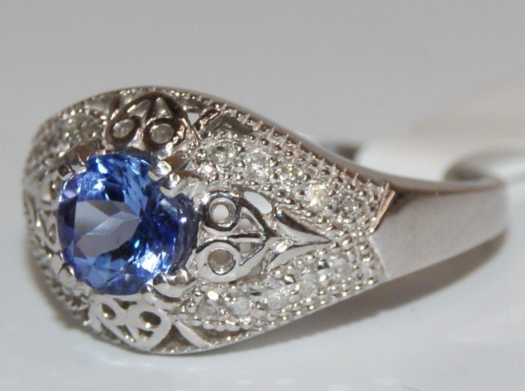 Retail Value $5,630 14Kt White Gold -- 1.00Ctw AAA Tanzanite Round & Diamonds Hand Carved Ladies Ring --