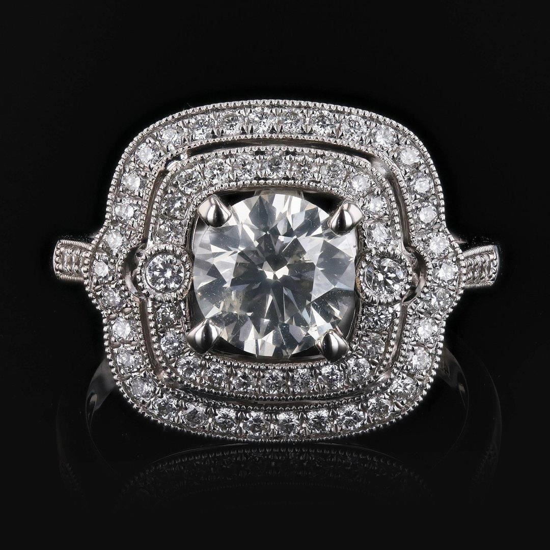 One electronically tested 14KT white gold ladies cast and assembled diamond unity ring. Condition is new, good workmanship. The featured diamond is set within tiered diamond bezels, supported by a lattice under gallery and diamond set shoulders, completed by a two millimeter wide band. Bright polish finish with milgrain detailing. Trademark is REKO. Identified with markings of "14K". Containing: One prong set round brilliant cut diamond, measuring 6.60 - 6.60 x 3.80mm (depth est.) exact weight 1.13ct. Cloud throughout. Graded in the setting. Clarity I-1 Color K Depth 57.6% Table 56.1% Polish Very Good Symmetry Good Seventy prong and bezel set round brilliant cut diamonds exact total weight 70 Stones = 0.45ctw. Graded in the setting. Clarity SI-2 to I-1 Color G - I Total Weight of Diamonds 1.58ctw. Total Weight of Ring 4.70 gm #Size: 7