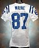 The bottom of the jersey has been custom hemmed and shortened with no tags remaining. On the inside back collar of the jersey is the manufacturer's tag with "04-46". On the front, back, and on each shoulder is the player number "87" in blue tackle twill. Across the back is "WAYNE" in blue tackle twill on a white name plate. On the front at the neck is the official "NFL Equipment" embroidered logo patch. On each sleeve below the player number is the "Reebok" embroidered logo. Inside the back tail of the jersey "1-2-05" is written in black marker. The jersey has white spandex sides and custom elastic sleeves. The jersey shows game use and besides being custom hemmed and shortened appears to have no alterations of any kind.