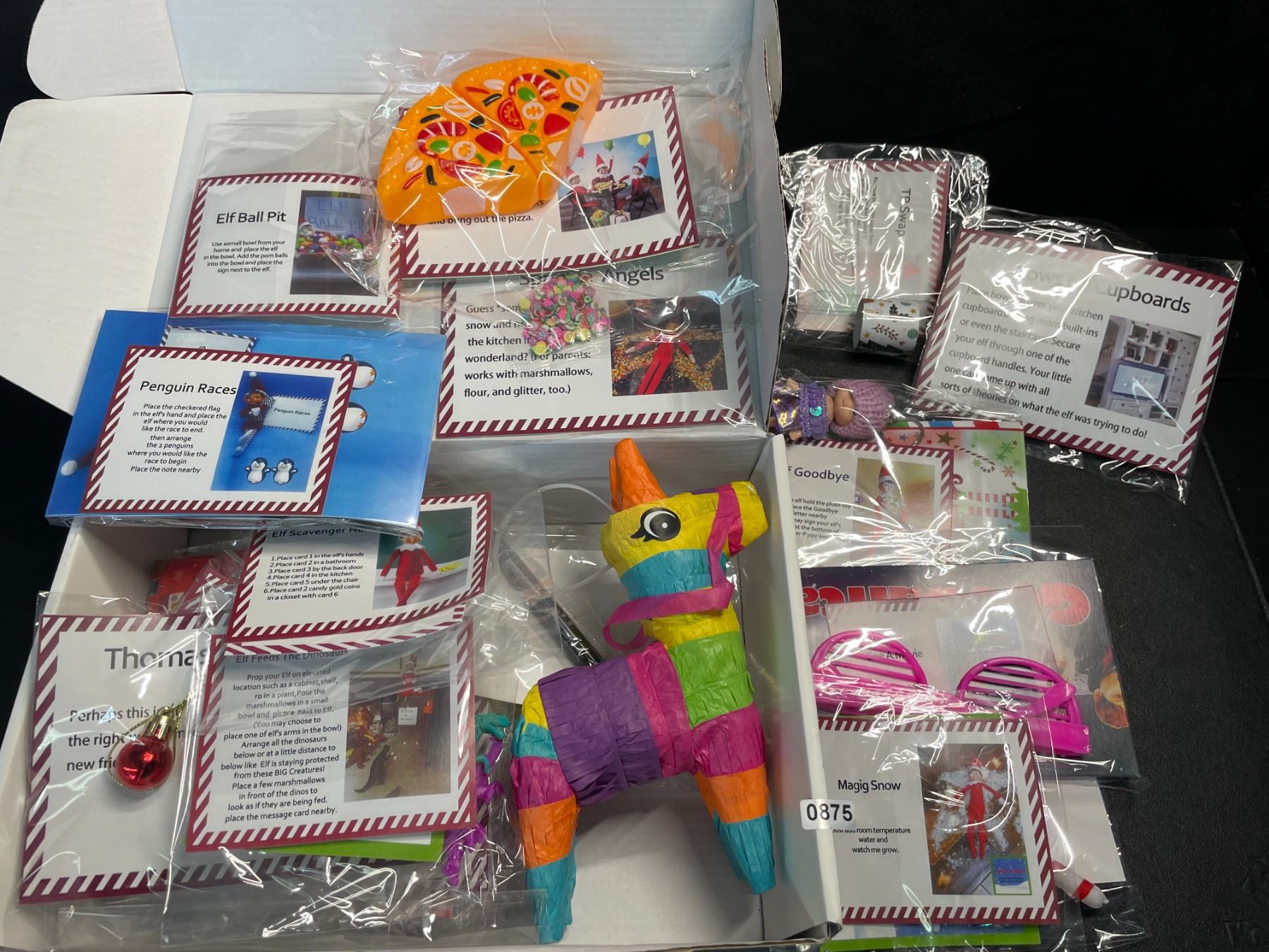 - contains various silly/fun elf on the shelf props/accessories (e.g. pinata elf prop, elf pizza party prop, glasses, bows, sprinkles, etc.