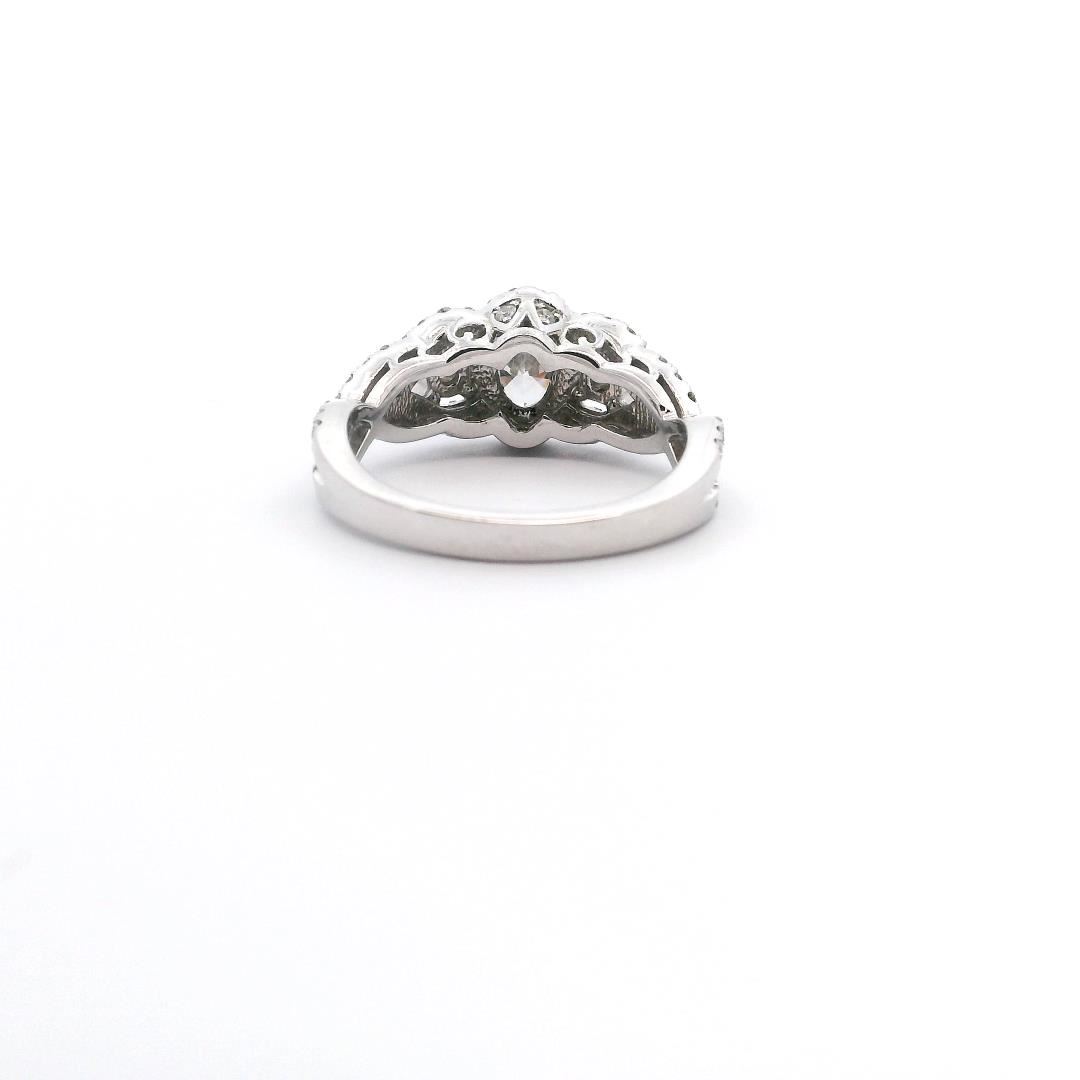 Celebrate elegance with this 1.37 ctw diamond halo wedding ring in 14KT white gold, featuring a stunning oval center diamond surrounded by a halo of brilliant diamonds. The center stone weighs 0.59ct with I-2 clarity and is flanked by two brilliant cut diamonds of 0.16ct, complemented by an additional 78 round brilliant diamonds totaling 0.62ct. This intricately designed ring offers a timeless sparkle for any bride seeking classic beauty.