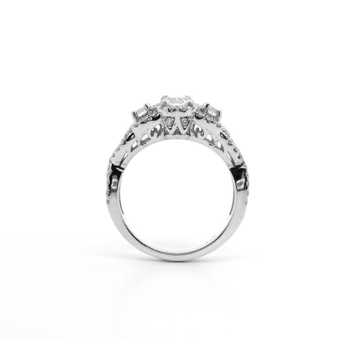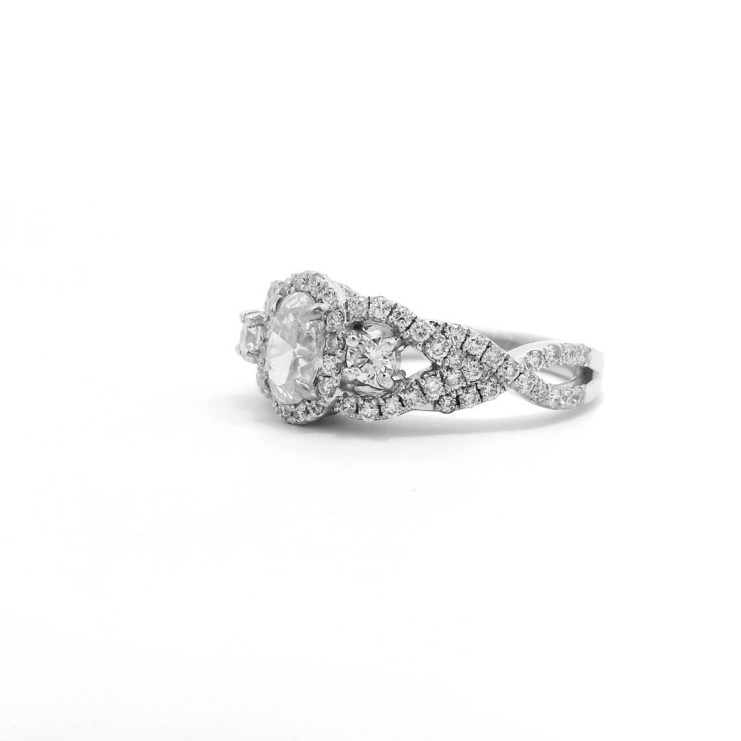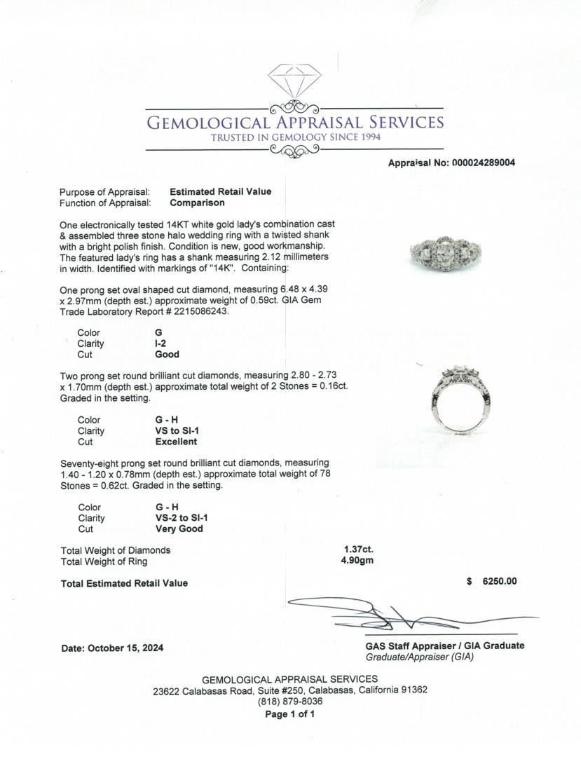 Celebrate elegance with this 1.37 ctw diamond halo wedding ring in 14KT white gold, featuring a stunning oval center diamond surrounded by a halo of brilliant diamonds. The center stone weighs 0.59ct with I-2 clarity and is flanked by two brilliant cut diamonds of 0.16ct, complemented by an additional 78 round brilliant diamonds totaling 0.62ct. This intricately designed ring offers a timeless sparkle for any bride seeking classic beauty.