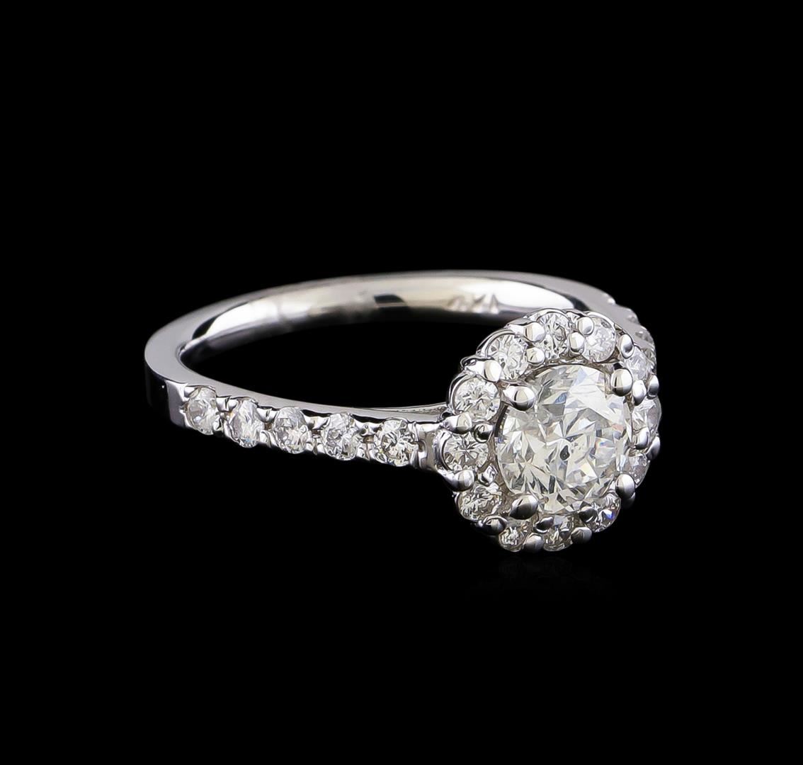One electronically tested 14KT white gold lady's cast wedding ring with a cathedral halo with a bright polish finish. The featured lady's ring has a shank measuring 1.92 millimeters in width. Identified with markings of "14K". Condition is new, good workmanship. Containing: One prong set round brilliant cut diamond, measuring 6.17 - 6.13 x 4.04mm (depth est.), 5.00.%. GTCF approximate weight of 1.00 ct. Graded in the setting. Clarity: I-1. Color: G - Very Good Ten prong set round brilliant cut diamonds, measuring 2.00 - 1.95 x 1.25mm (depth est.) approximate total weight of 10 Stones = 0.30 ct. Graded in the setting. Clarity: SI-1 to SI-2. Color: H - I. Cut Good Twelve prong set round brilliant cut diamonds, measuring 1.90 - 1.85 x 1.15mm (depth est.) approximate total weight of 12 Stones = 0.30 ct. Graded in the setting. Clarity: SI-1 to I-1. Color: H - I. Cut Good. Total Weight of Diamonds 1.60 ct. Total Weight of Ring 3.70gm. GAS Appraised.