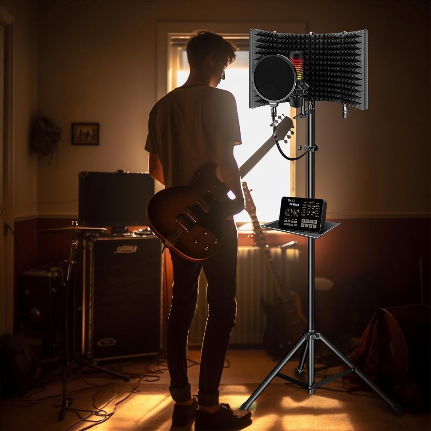 - Professional Studio Recording Microphone Isolation Shield, Pop Filter,High Density Absorbent Foam is Used to Filter Vocal. Suitable for Blue Yeti and Other Condenser Microphones (AO-504 with Stand)
