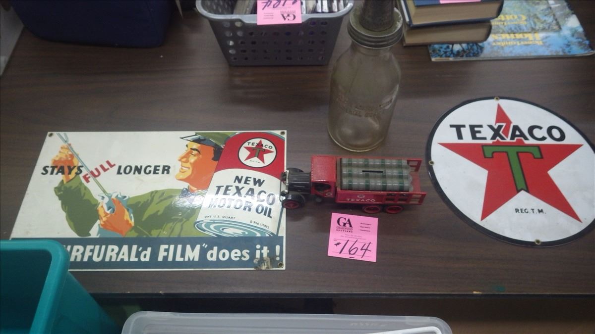 1 COLLECTIBLE OIL JAR AND 2 TEXACO PORCELAIN SIGNS (ANDE ROONEY REPRO USA) PLUS TEXACO KENWORTH METAL BANK