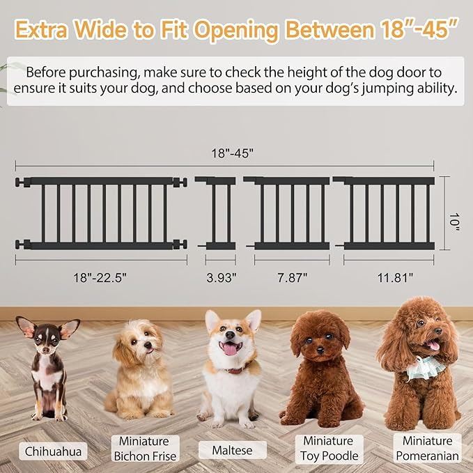 Dog Gate - 18"-45" Adjustable Extra Wide Metal Short Dog Gate to Step Over, 10" Tall Small Pet Gate with 3 Extension Kits, Pressure Mounted for Doorways & Stairs