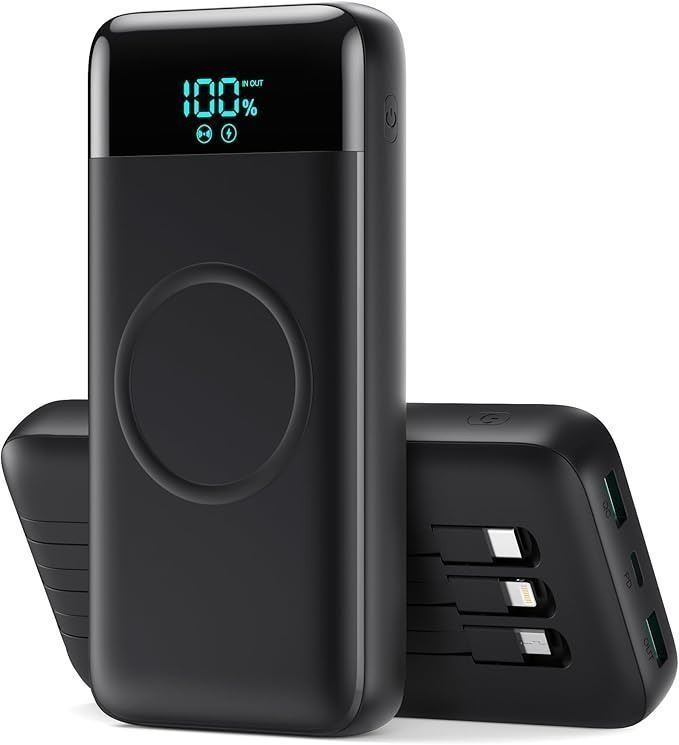 - Wireless Power Bank (High-capacity 40,800mAh) 7-in-1 Portable Charger with 3 Built in Cables,15W Wireless Charging 25W PD QC 4.0 Fast Charging USB C LCD Display Battery Pack for iPhone 16/15/13/12,Samsung,Android etc.