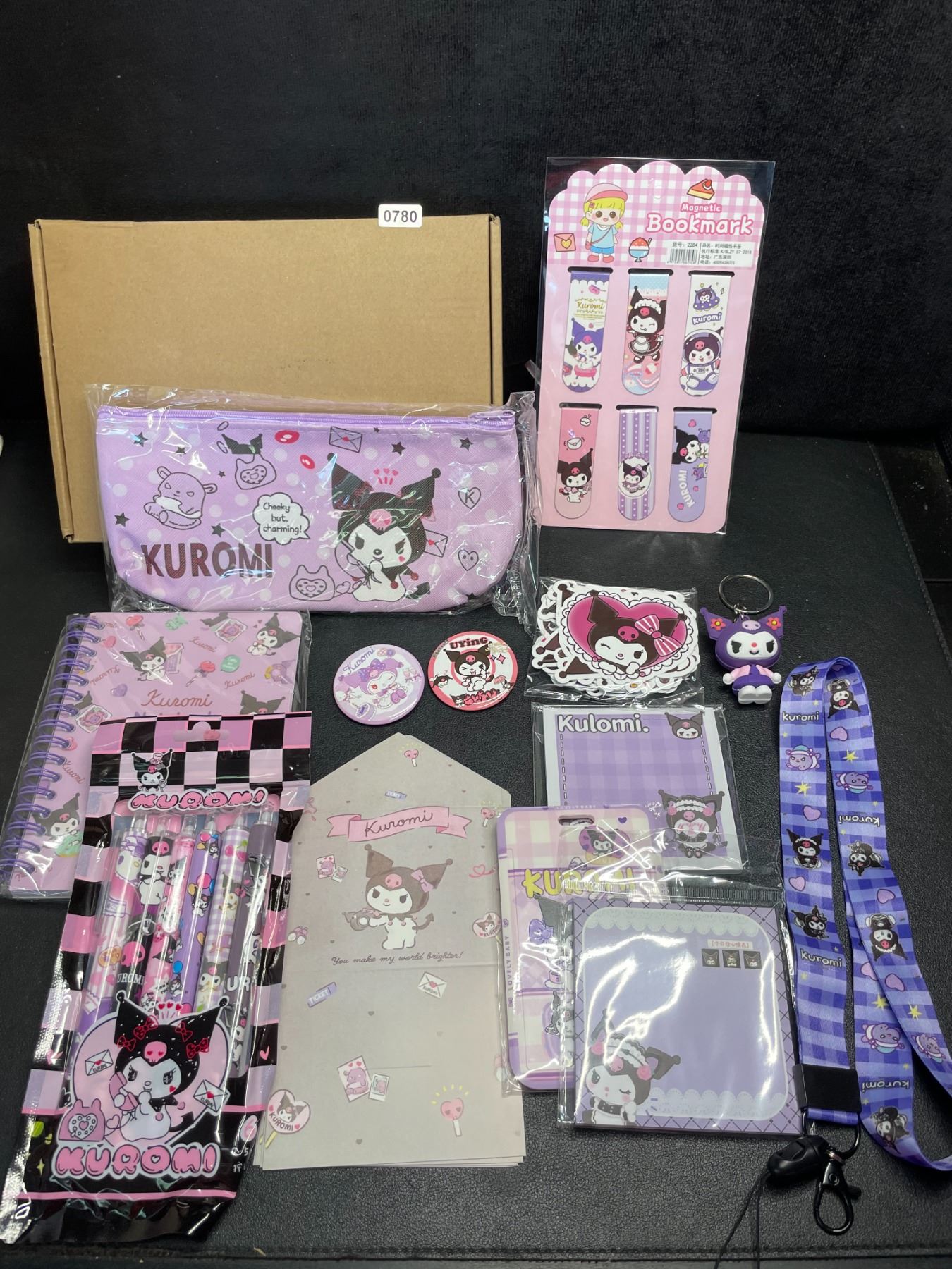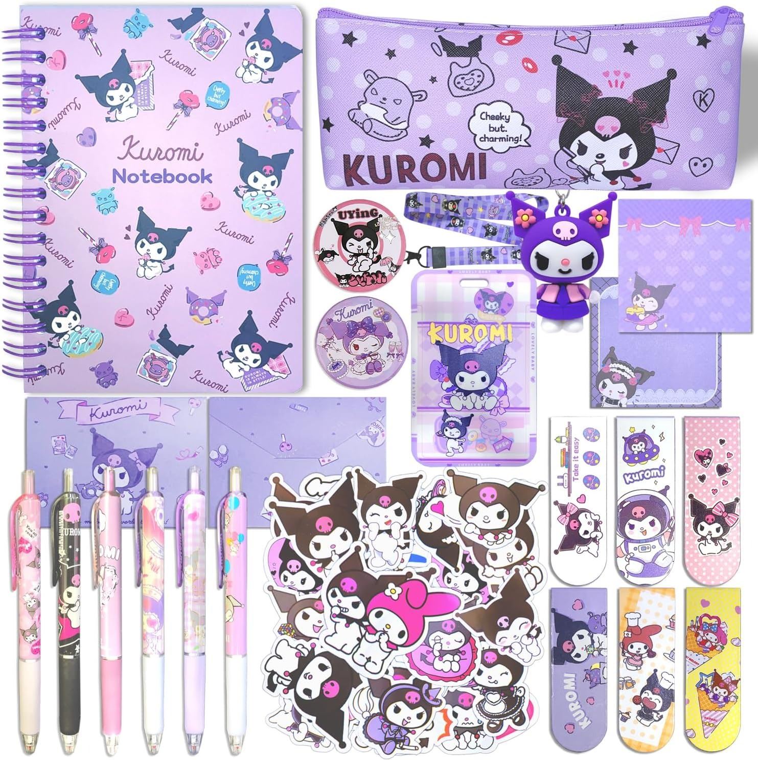 Package Includes: 25 charming items including 1 journal, 1 pencil case, 6 ballpoint pens, 1 ID badge holder with lanyard, 6 bookmarks, 2 notepads, 50 pcs stickers, 2 pin badges, 5 greeting cards, and 1 cute key chain. Every piece in this set showcases the beloved Kuromi character!