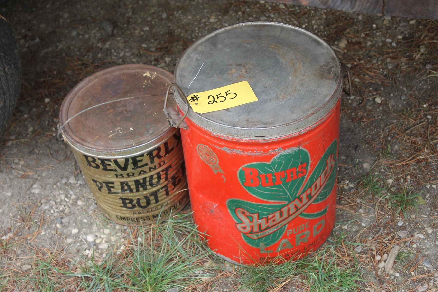 1 - LARGE BEVERLY BRAND PEANUT BUTTER PAIL,1 - BURNS SHAMROCK LARD PAIL
