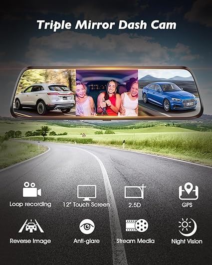 - doge&vollar 12" rear view mirror camera, 4k dash cam front and rear, intelligent full touch screen with hardwire kit, free 64gb card included & gps