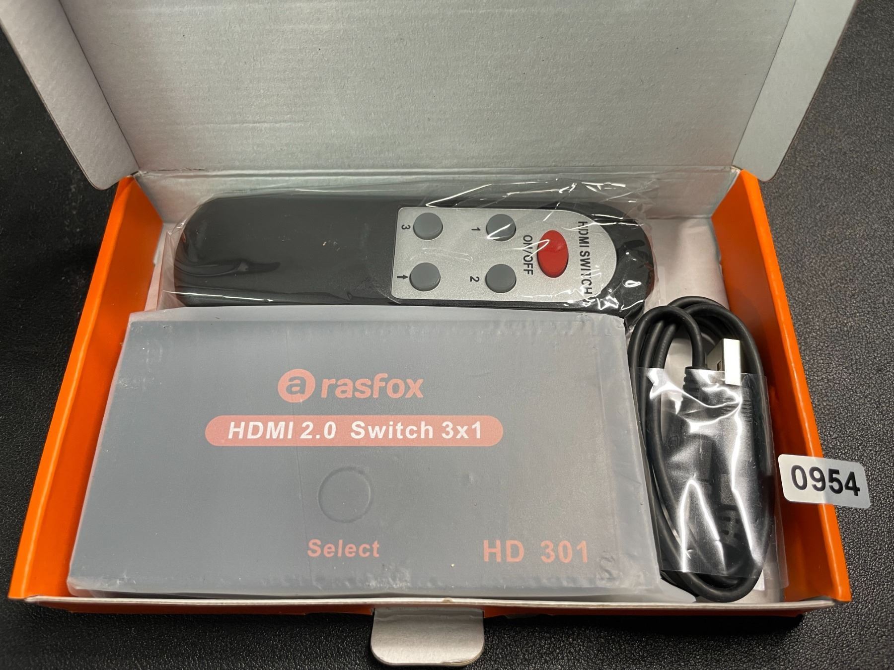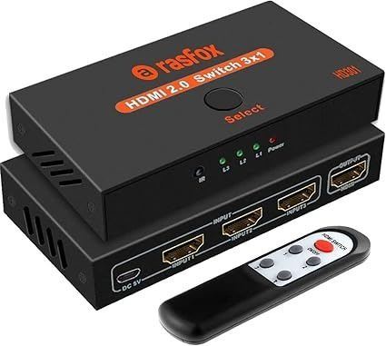 Rasfox HD301 Powered 3-Port HDMI Switch Switcher Selector Splitter with IR Remote; HDMI 2.0 4K @60Hz; 3 in 1 Out; Connect 3 HD Devices to 1 HDTV Port