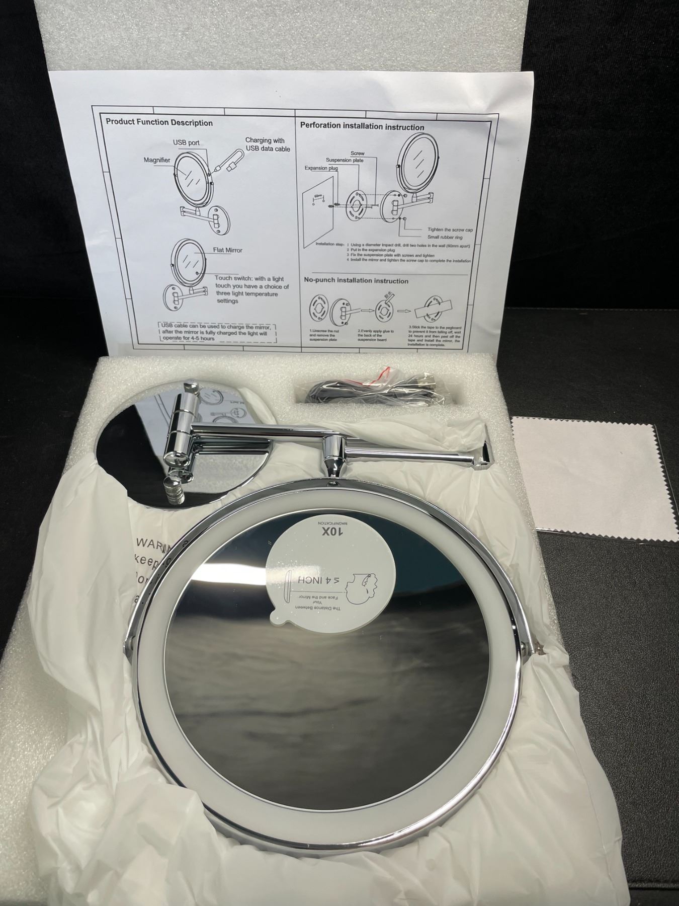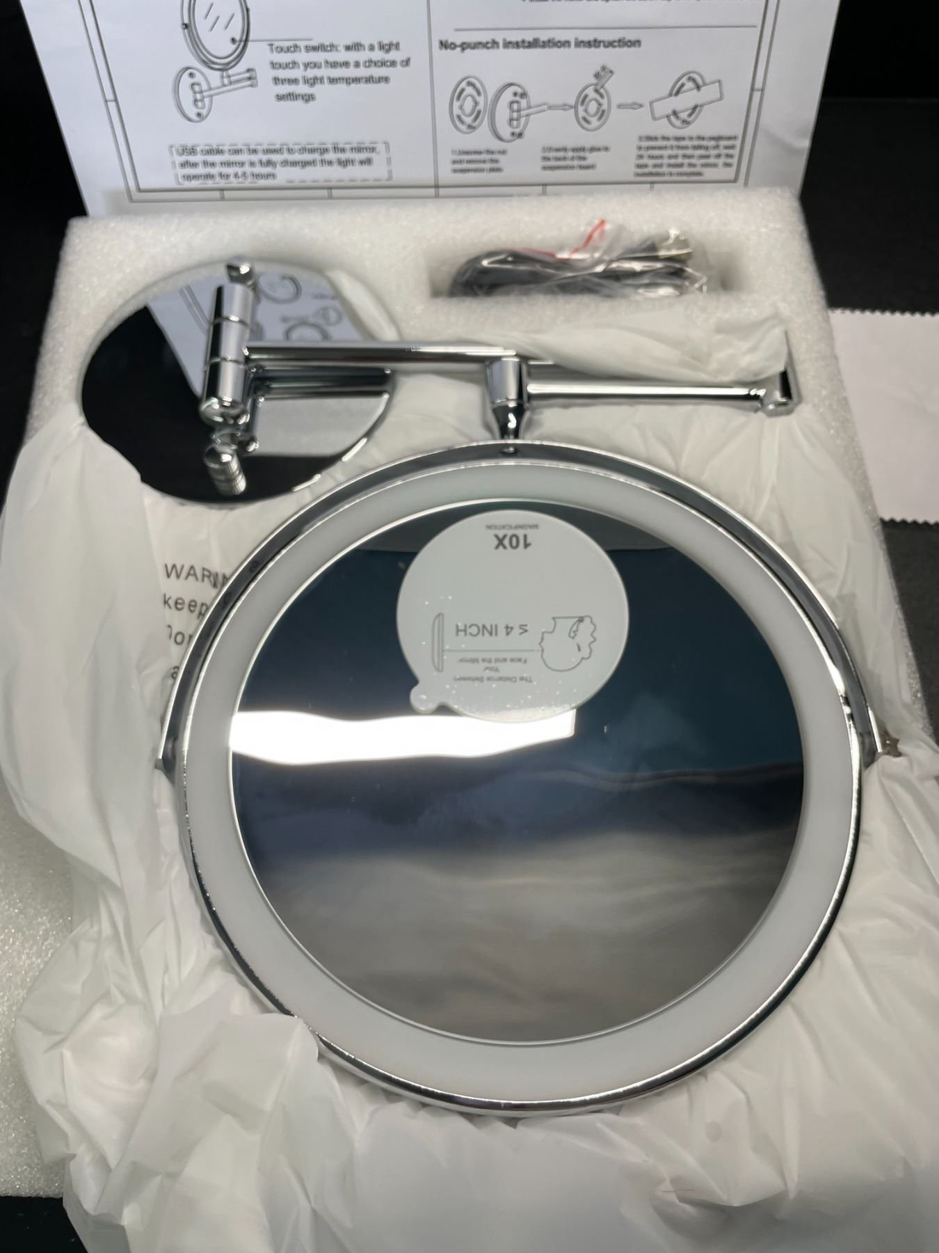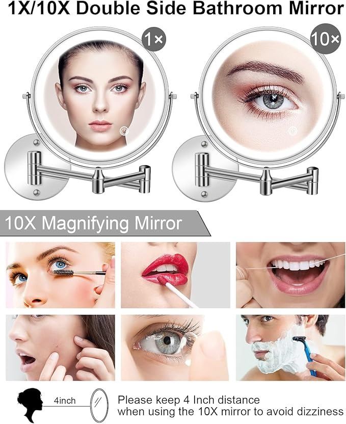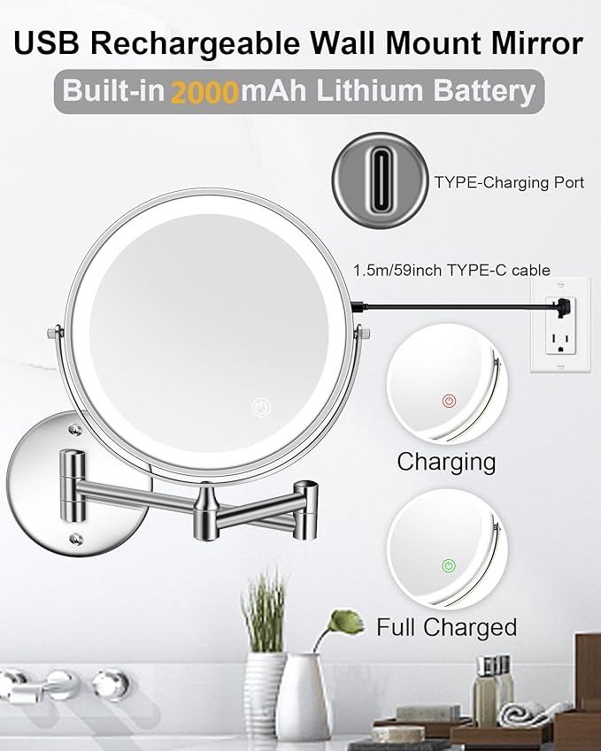 - Rechargeable Lighted Wall Mounted Makeup Mirror, 8" Double-Sided 1X/10X Magnifying Bathroom Mirror with 3 Color Lighting, Touch Screen Dimmable 360° Swivel 13 Inch Extendable Chrome Vanity Mirror