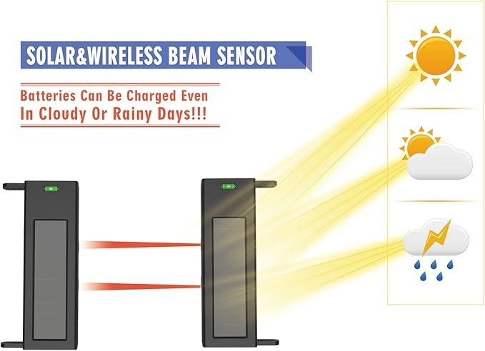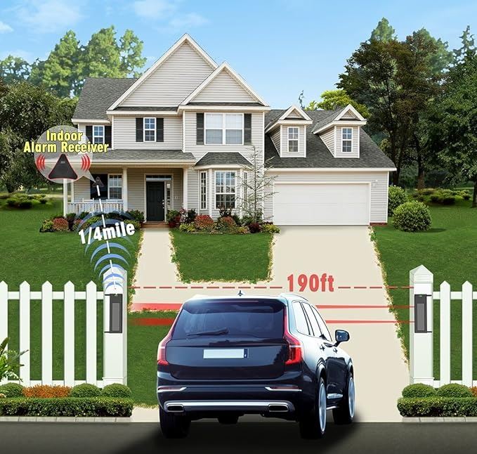 - HTZSAFE Solar Wireless Driveway Alarm System- 1/4 Mile Long Transmission Range- 190 Feet Wide Sensor Range- No Wiring No Need Replace Battery- Outdoor Weatherproof DIY Security Perimeter Alert System