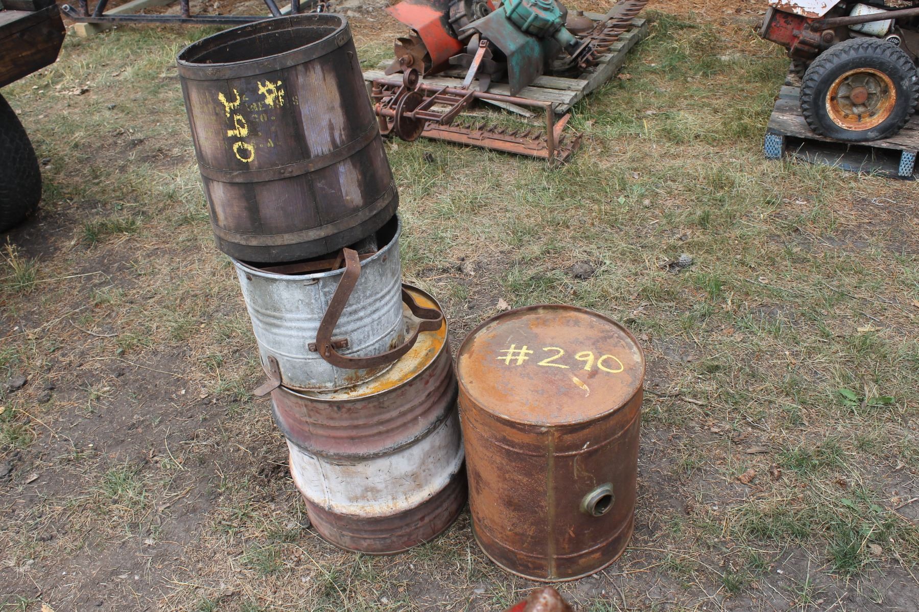 1 - TIN BARREL, 1 - GAS TANK, 1- WOODEN KEG