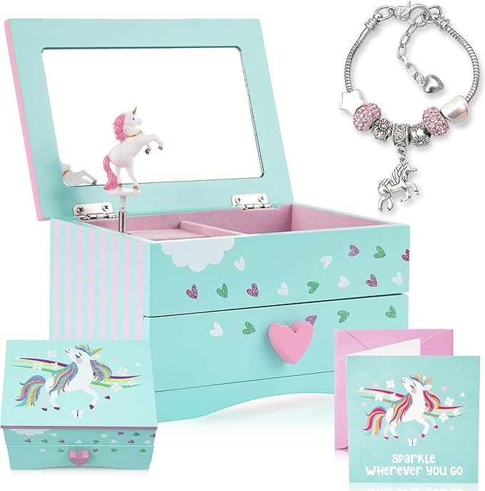 - Two Unicorn Presents In One: This is a beautiful unicorn music jewelry box, complete with a pull-out drawer, large mirror, and spinning/musical unicorn. Inside the box, you will find a stunning unicorn charm bracelet with rhinestone beads, presented in pretty pink organza pouch.