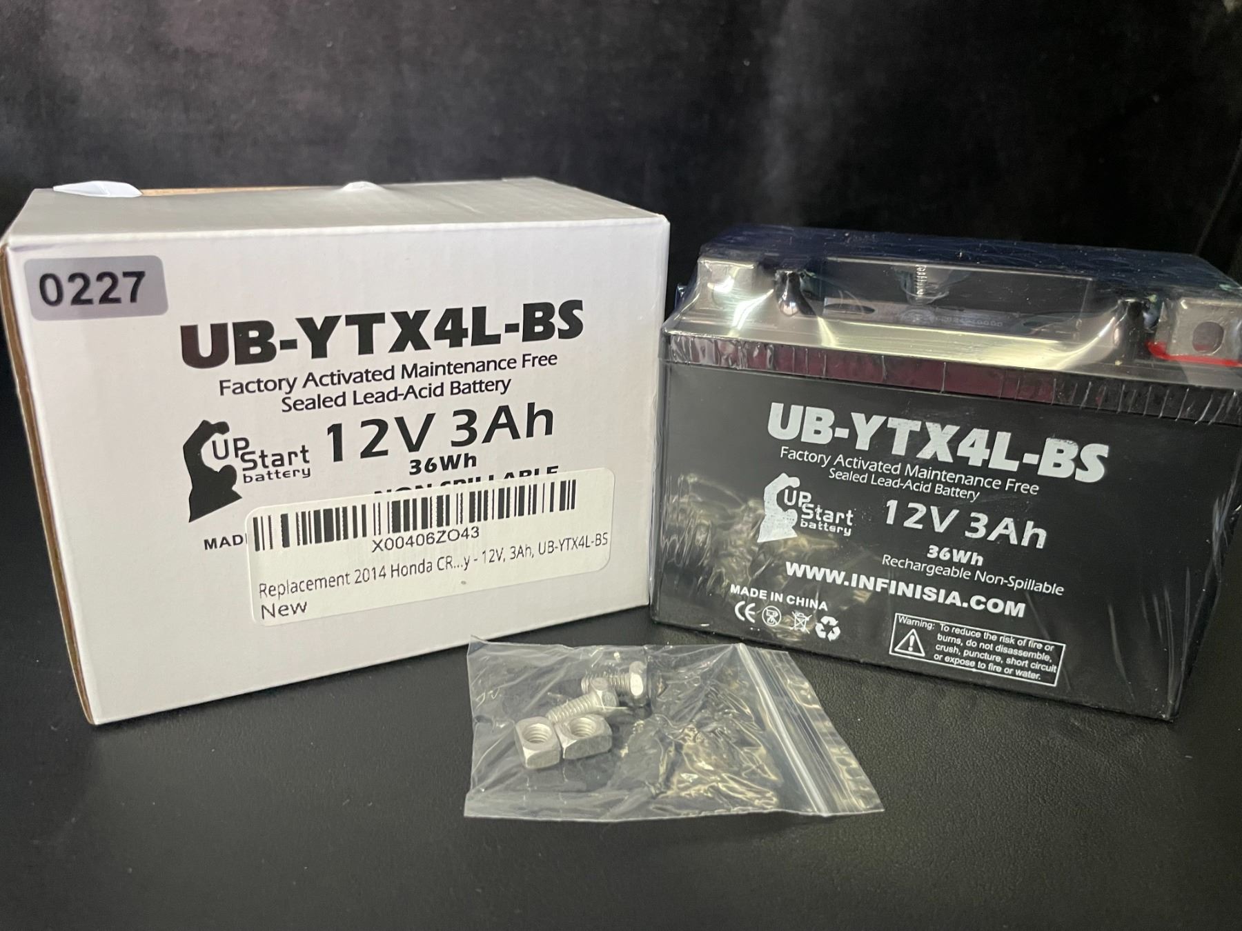 - Replacement 2014 Honda CRF110F 110CC Factory Activated, Maintenance Free, Motorcycle Battery - 12V, 3Ah, Model: UB-YTX4L-BS
