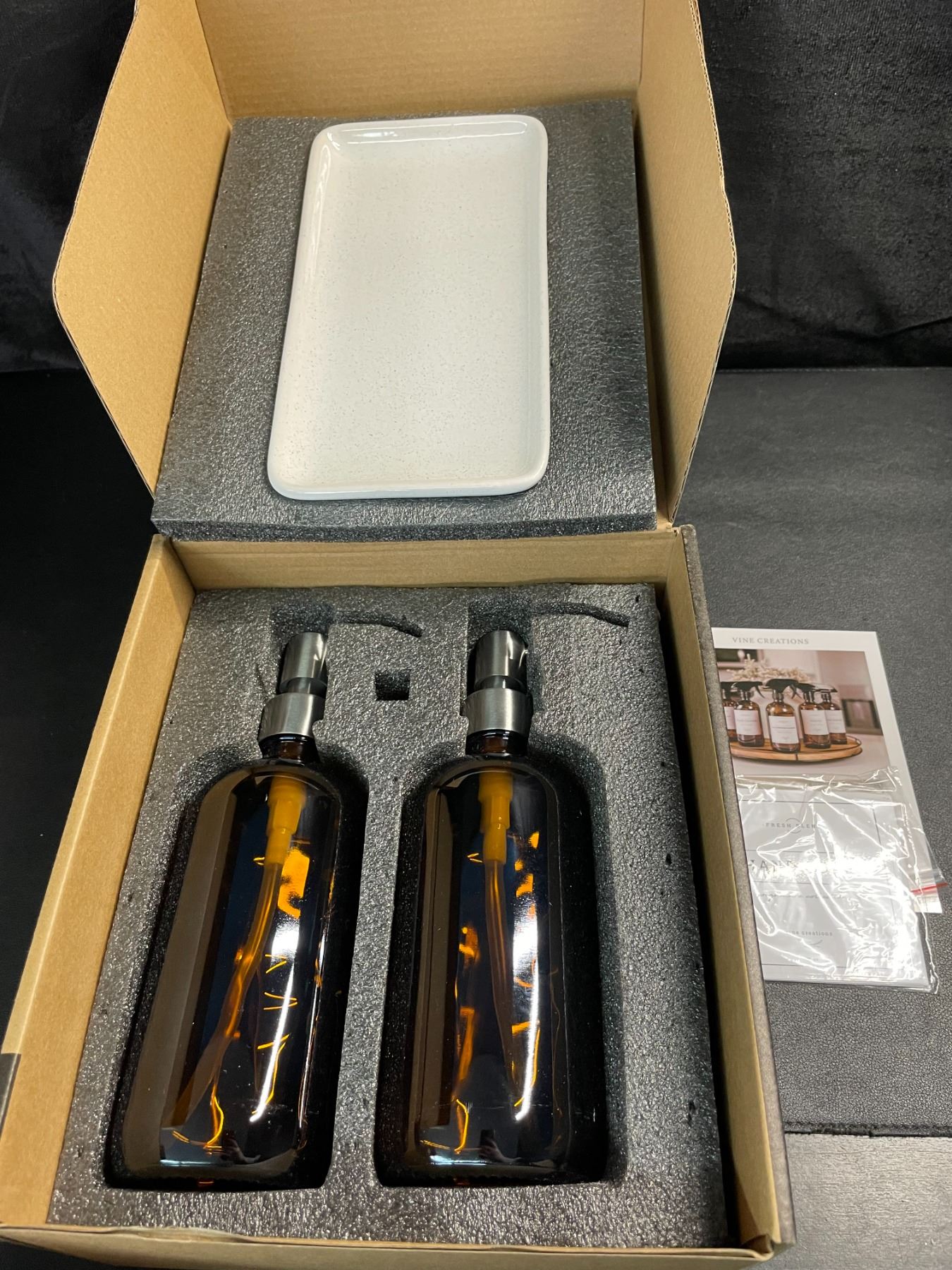 1 Vine Creations Premium Quality Amber Glass Soap Dispenser Set (16oz) w/ Ceramic Tray/Labels - New