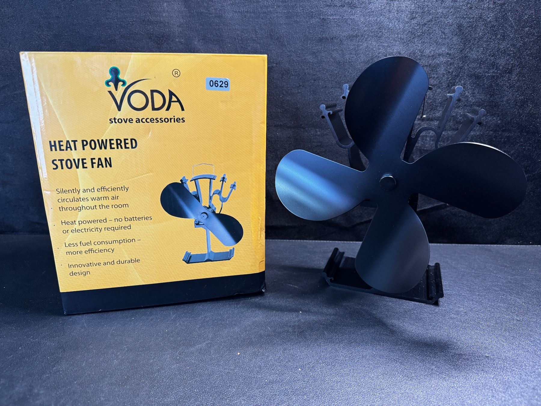 No power needed works solely off of heat no batteries efficient and quiet design.