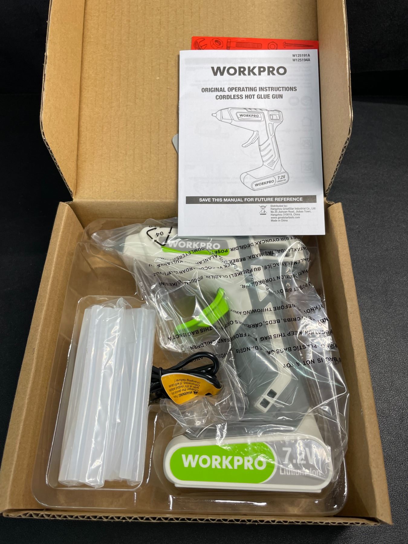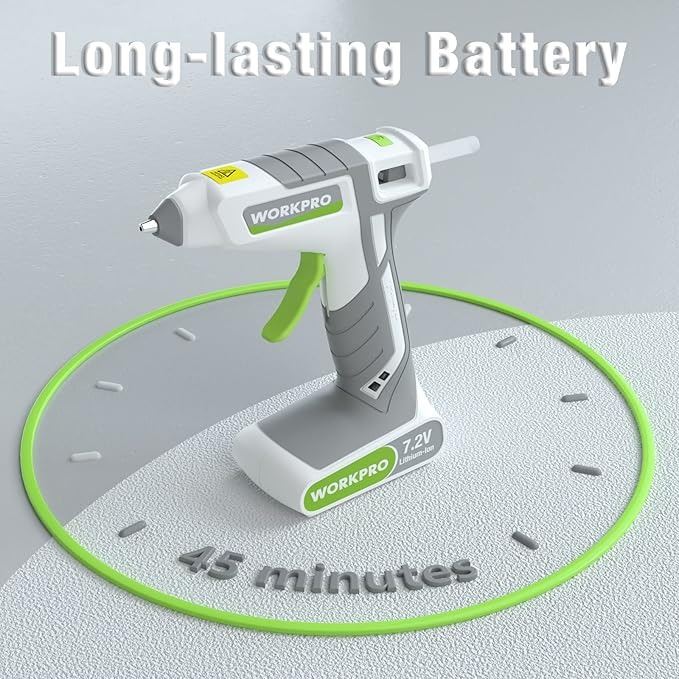 - WORKPRO 7.2V Cordless Hot Melt Glue Gun, Rechargeable Fast Preheating Glue Gun Kit with 20 Pc Premium Glue Stick, Automatic-Power-Off Glue Gun for Art, Craft, Decoration, Repair, Type-C Cable Included