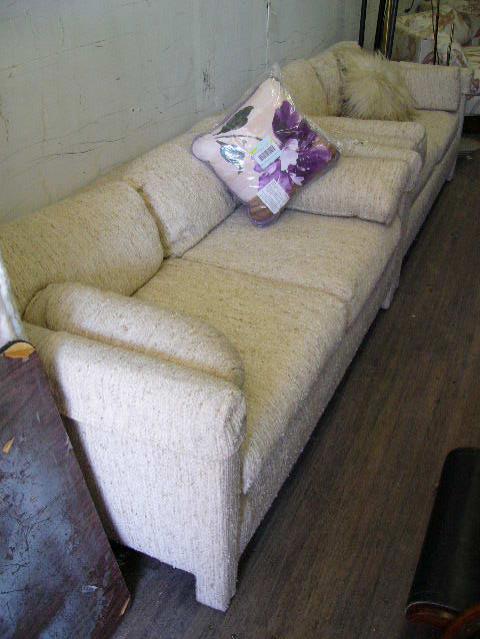 1 brass colored floor lamp; 1 single bulb hanging chandelier with 5 octagonal glass panels; 2 white loveseat couches (24)