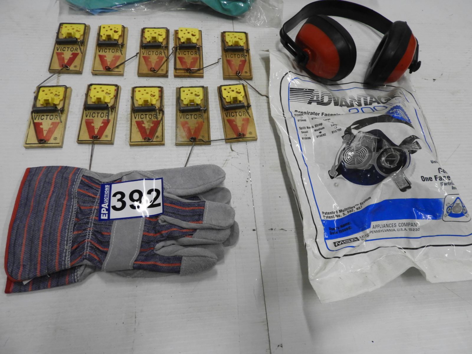 (1) pair new gloves, (10) experienced mouse traps, hearing protection, respirator and cartridges (new), Nitrile rubber gloves (new), Chemical goggles (new)