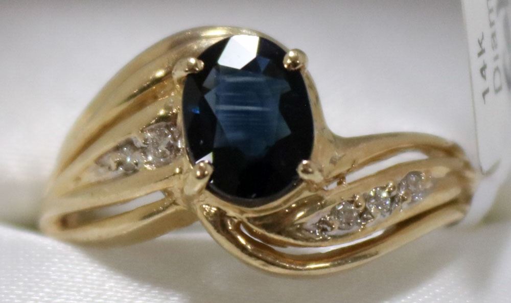 SIZE 8.75 WITH LOCAL APPRAISAL, ONE OVAL SHAPED NATURAL SAPPHIRE, SAPPHIRE WEIGHS 1.35 CARATS, FOUR BRILLIANT CUT DIAMONDS, CLARITY GRADE SI 1-2, COLOR GRADE I-J, CARAT WEIGHT 0.06 CARATS, TOTAL WEIGHT 4.40 GRAMS. SUGGESTED INSURANCE COVERAGE $1,800.00. JEWELLERY