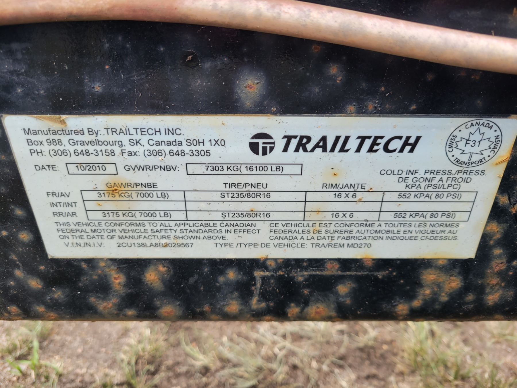 10/2010 Trailtech Trailer 20'x 98" deck, 28" beavertail, 2 5/16 ball hitch, Trailer has hyd. Tilt & hyd. Lift, 2x 7,000 lb axles, SN. 2CU138LA8B2029567
