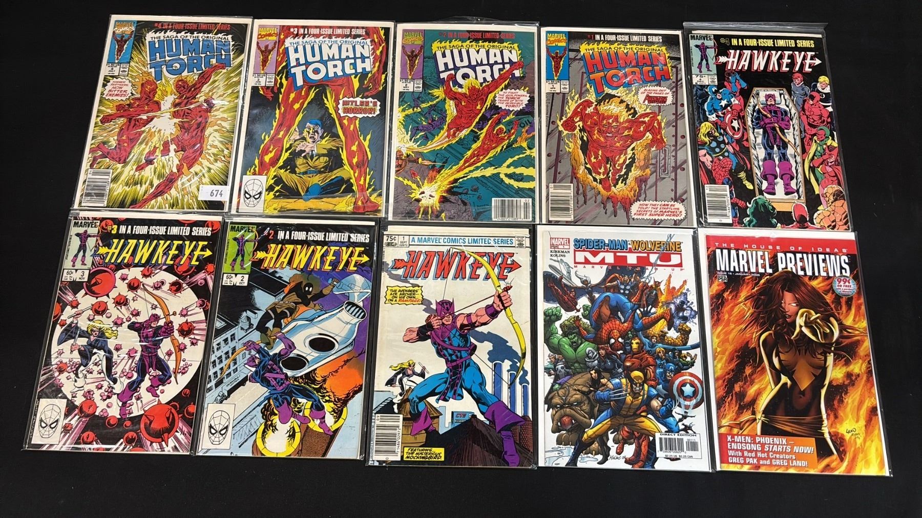 (10) MARVEL COMIC BOOKS; HUMAN TORCH LIMITED SERIES #1-4, HAWKEYE LIMITED SERIES #1-4, MTU SPIDER-MAN & WOLVERINE #1, MARVEL PREVIEWS #15