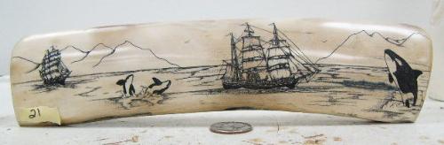 10" scrimshawed mammoth ivory with 2 sailing ships and 3 killer whales by Homer Cole (114)