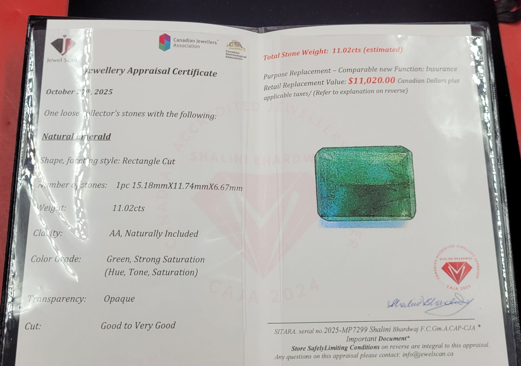 $11,020 Appraisal - 11.02 ct Cert. Emerald Gemstone