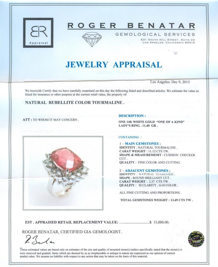 One 14KT White Gold "One of a Kind" Lady's Ring, 11.40 grams. Containing: Main Gemstones: Identity: Natural Tourmaline. Carat Weight: 11.12 cts tw. Shape & Measurement: Cushion Checker Cut. Quality: Fine color and cutting. Adjacent Gemstones: Identity: Natural Diamonds. Shape: Round Brilliant Cut. Carat Weight: 2.37 cts tw. Quality: SI Clarity, G-H Color. All fine cutting and proportions. Total Gemstones Weight: 13.49 cts tw. RBGS Appraised.