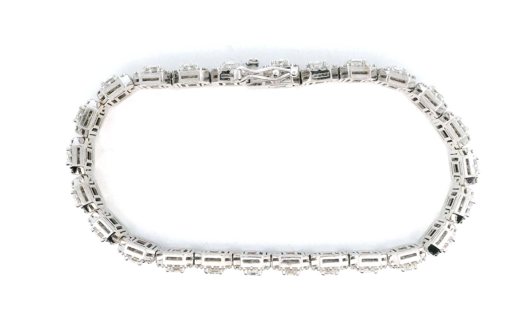 This bracelet features 25 emerald cut diamonds totaling 6.15ct with VS-1 to VS-2 clarity and G-H color, surrounded by 350 round brilliant diamonds totaling 5.00ct. A stunning tennis bracelet design! One electronically tested 14KT white gold lady's combination cast & assembled diamond tennis bracelet with a tongue clasp & fold over safety with an emerald cut motif with a bright polish finish. Condition is new, good workmanship. The featured lady's bracelet measures 7 inches in length. Identified with markings of 14K. Containing: Twenty-five prong set emerald cut diamonds, measuring 4.32 x 2.98 x 1.98mm (depth est.), approximate total weight of 25 Stones = 6.15ct. Graded in the setting. Color: G-H Clarity: VS-1 to VS-2 Cut: Excellent Three hundred fifty prong set round brilliant cut diamonds, measuring 1.60 - 1.55 x 0.95mm (depth est.), approximate total weight of 350 Stones = 5.00ct. Graded in the setting. Color: G-I Clarity: VS-1 to SI-1 Cut: Very Good Total Weight of Diamonds: 11.15ct. Total Weight of Tennis Bracelet: 24.60gm Total Estimated Retail Value: $52500.00 Appraisal No: 000024088010