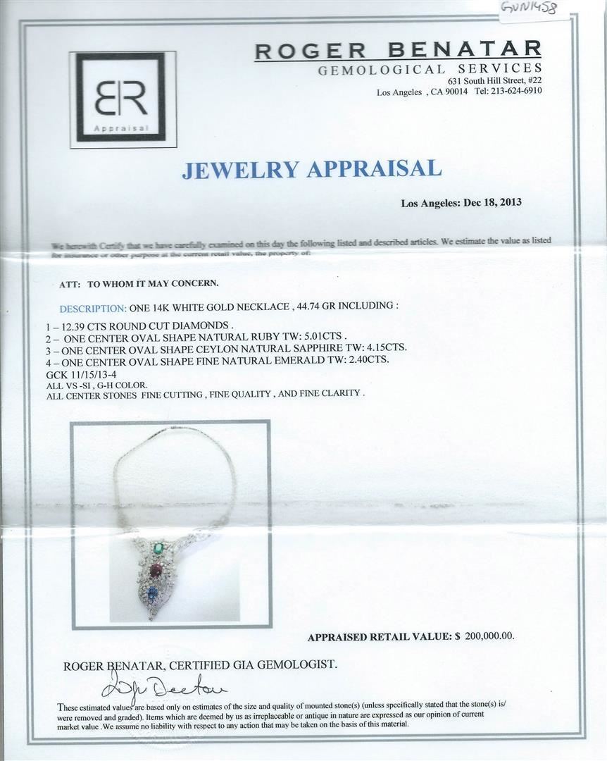 One electronically tested 14KT white gold necklace weighing 44.74 grams including round cut diamonds weighing 12.39ctw, one center oval shape natural ruby weighing 5.01ctw, one center oval shape Ceylon natural sapphire weighing 4.15ctw and one center oval shape fine natural emerald weighing 2.40 ctw. All VS-SI, G-H color. All center stones fine cutting, fine quality. RBGS Appraised.