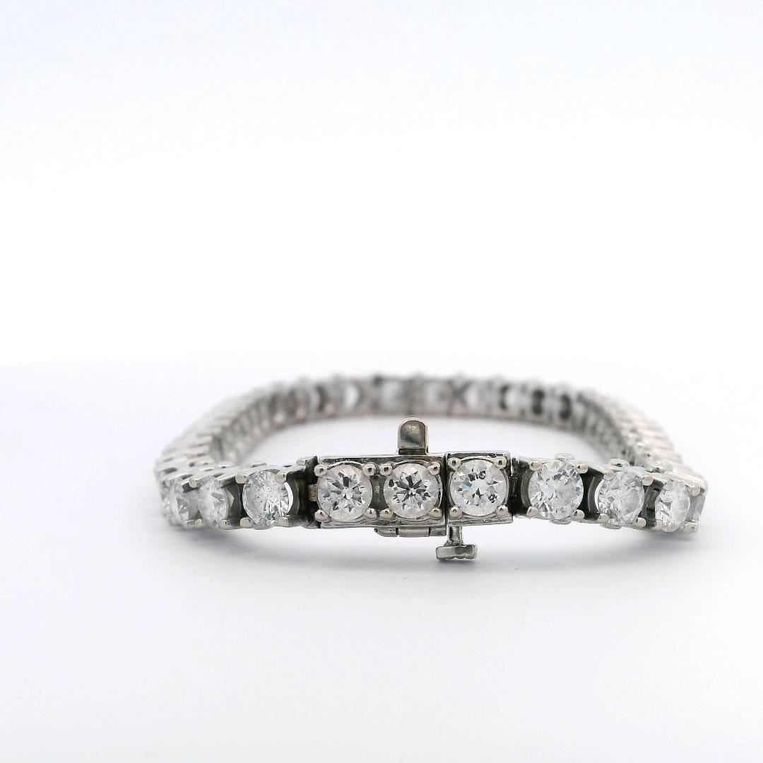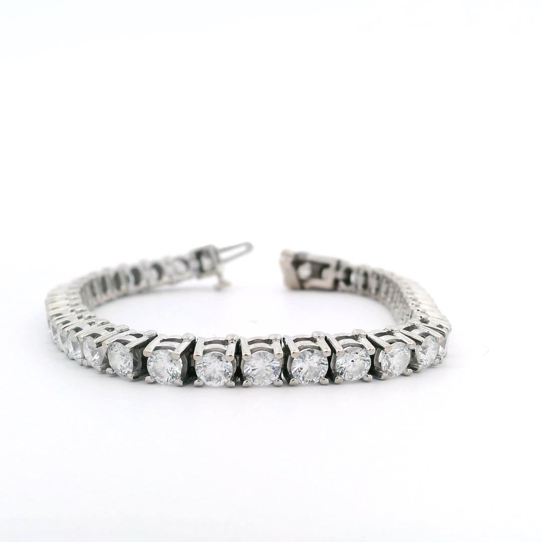 Stand out with this unique 14KT white gold tennis bracelet, featuring a captivating yellow-brown hue in its diamonds. This 7-inch bracelet showcases 36 prong-set round brilliant cut diamonds totaling 11.98 carats, graded from VS-2 to SI-2 in clarity. With its polished setting and distinctive color, it's an ideal choice for anyone looking to add a rare and luxurious piece to their collection.