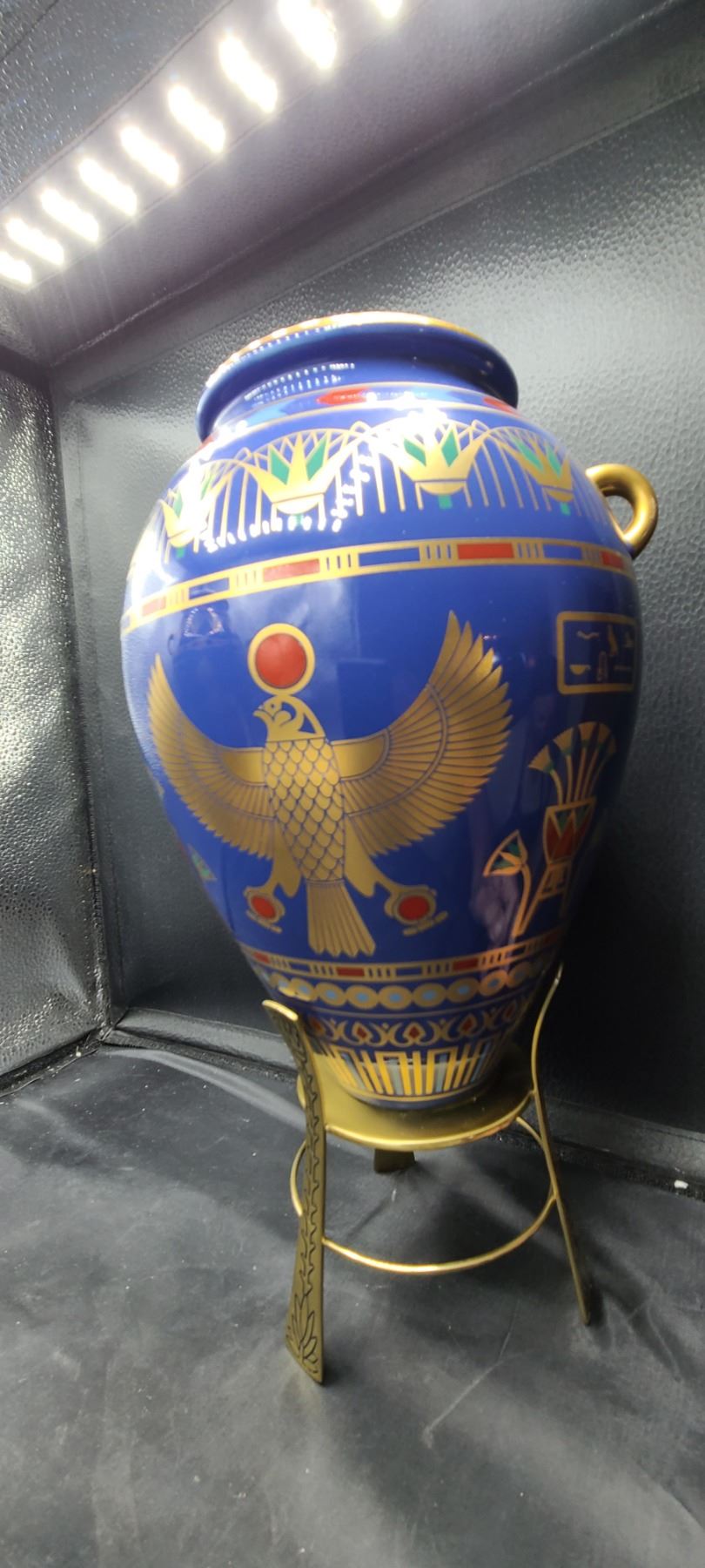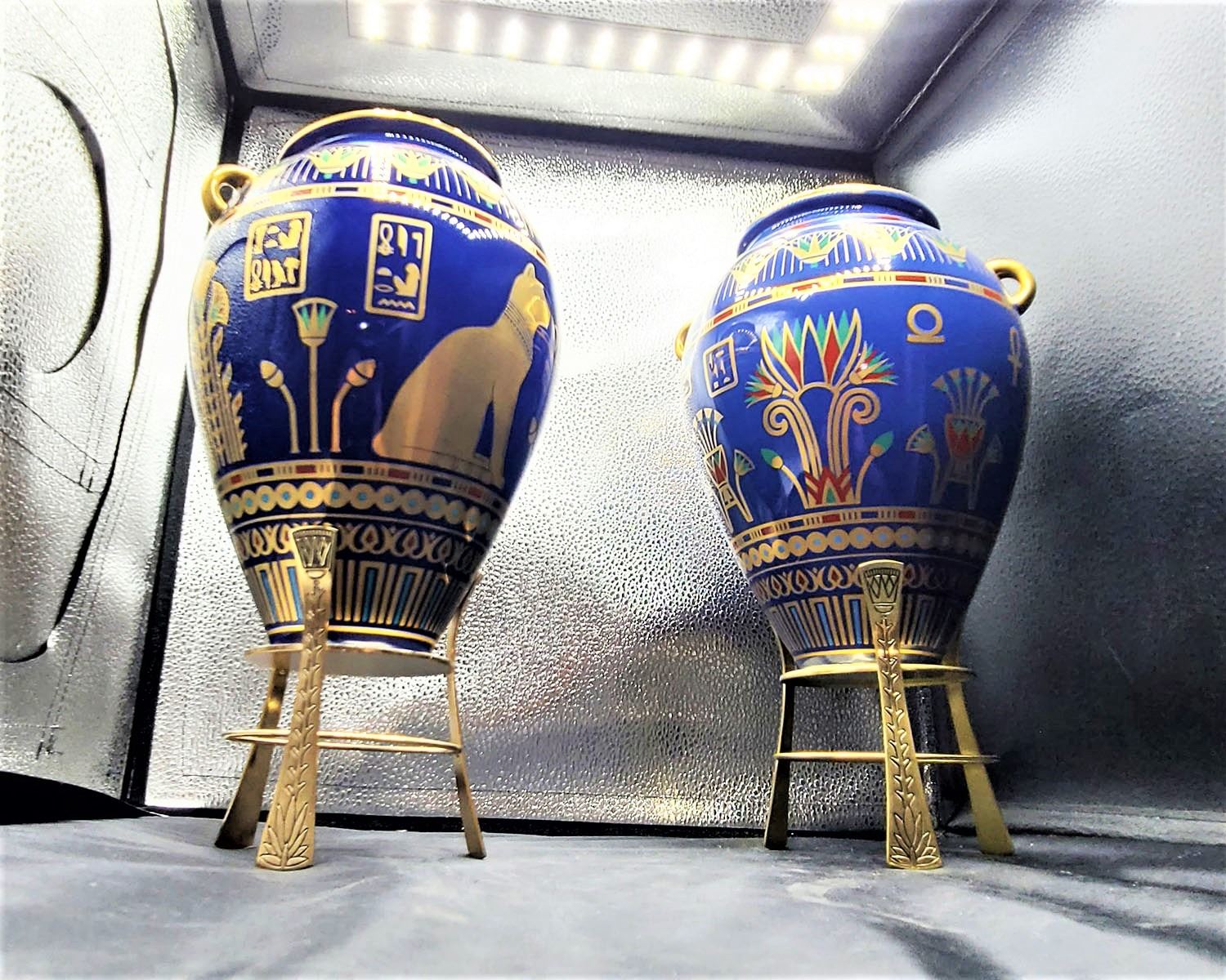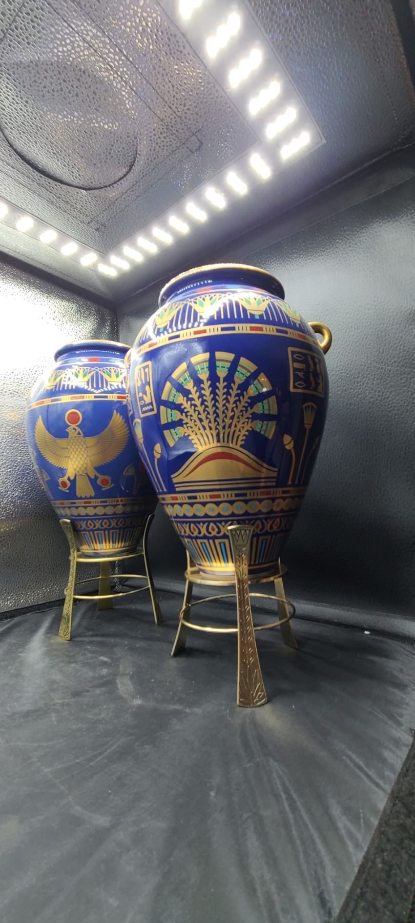 Pair of 11" imported porcelaine vases, glazed in lapis blue with hand decorated 24k gold. By Roushdy Iskander Garas Includes display stands, COA, bio of artist. Pick up 9-10