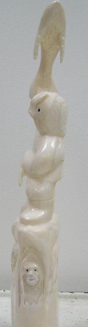 11" white walrus ivory carving of whale man dancer with 4 whales and 2 men's faces and a man (114)