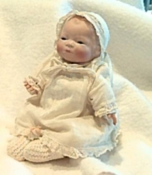 Marked on chest "Bye-lo-baby pat appl. for by Grace S. Putnam", made in Germany, porcelain head, cloth body, diaper, long white socks, muslin dress, hat, painted hair.