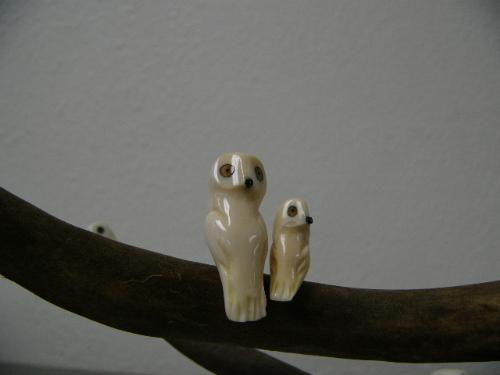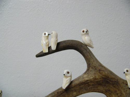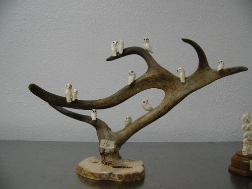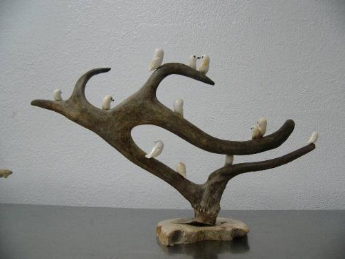 12 ivory birds with inset fossilized ivory eyes and baleen noses mounted on caribou horn with bone base carved by H. B. Slwooko ()