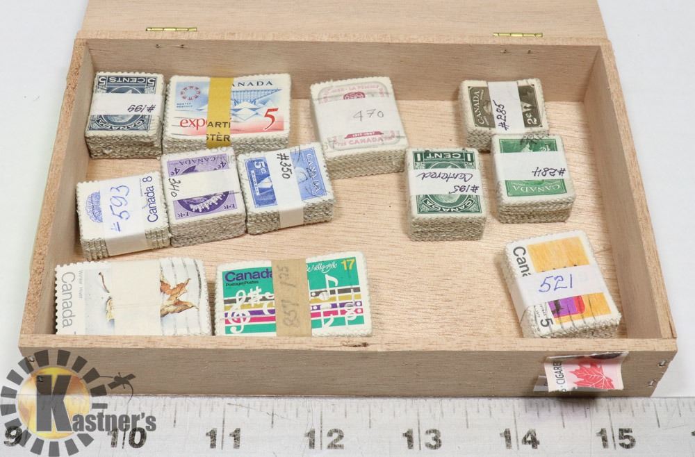 12X100 LOT CATALOGUED CANADIAN STAMPS IN CIGAR BOX