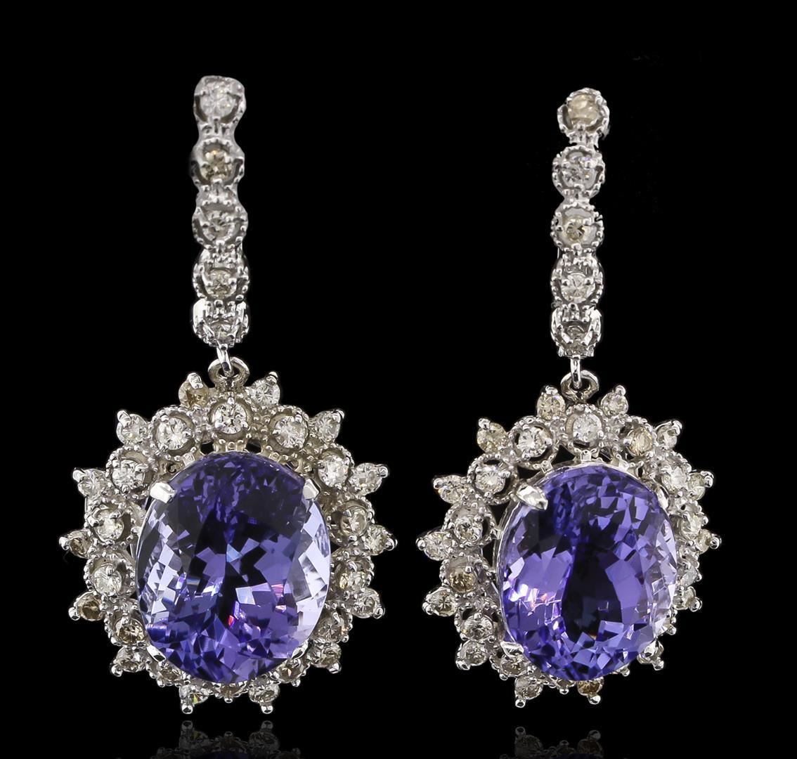 One pair electronically tested 14KT white gold ladies cast tanzanite and diamond earrings with hinged clip backs with a bright polish finish. Identified with markings of "14K". Condition is new. Containing: Two prong set oval modified brilliant cut natural tanzanites, measuring 13.60 x 10.90 x 7.09mm, approximate. Total Weight of 14.78ct., clarity is eye clean, type I, medium light, very slightly grayish, violet color, (GIA V 4/3), cut is good. Sixty-Six prong set round brilliant cut diamonds, measuring 1.60 - 1.00 x 0.78mm (depth est.) approximate. Total Weight of 66 Stones = 0.53ct. Clarity: SI-2. Color: J - K, Cut is Good. Colored gemstones are presumed to have been subjected to commonly used enhancement processes. All diamonds and colored gemstones are graded in the mounting, unless otherwise stated. Total Weight of Colored Stones 14.78ct. Total Weight of Diamonds 0.53ct. Total Weight of Earrings 11.20 grams. GGL Appraised.