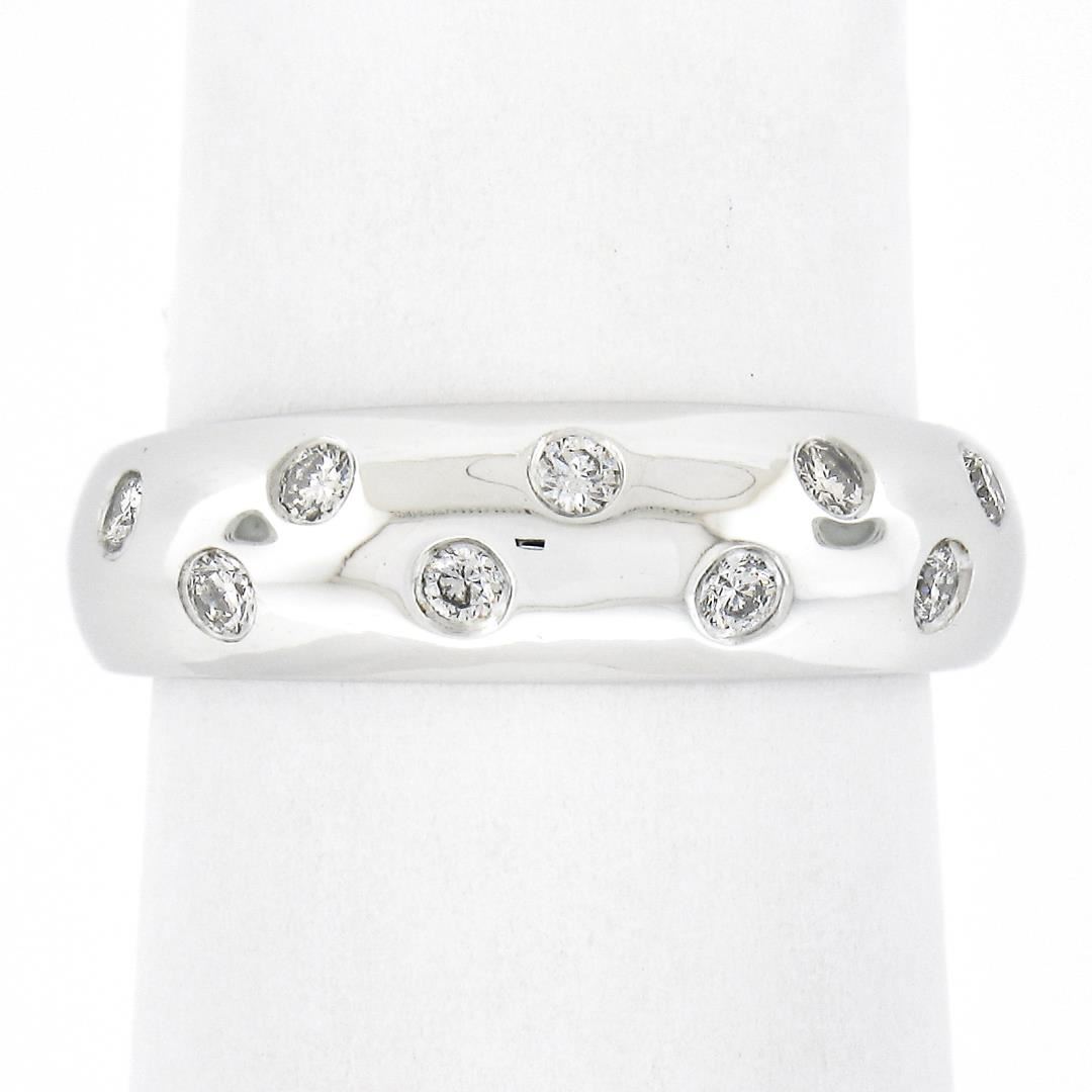 A solid 14k white gold band ring, with 9 round cut natural diamonds (H - VS1 ; 0.18ctw). The ring is size 5.0, weighs a total of 3.8 grams, and measures 5.9mm wide.