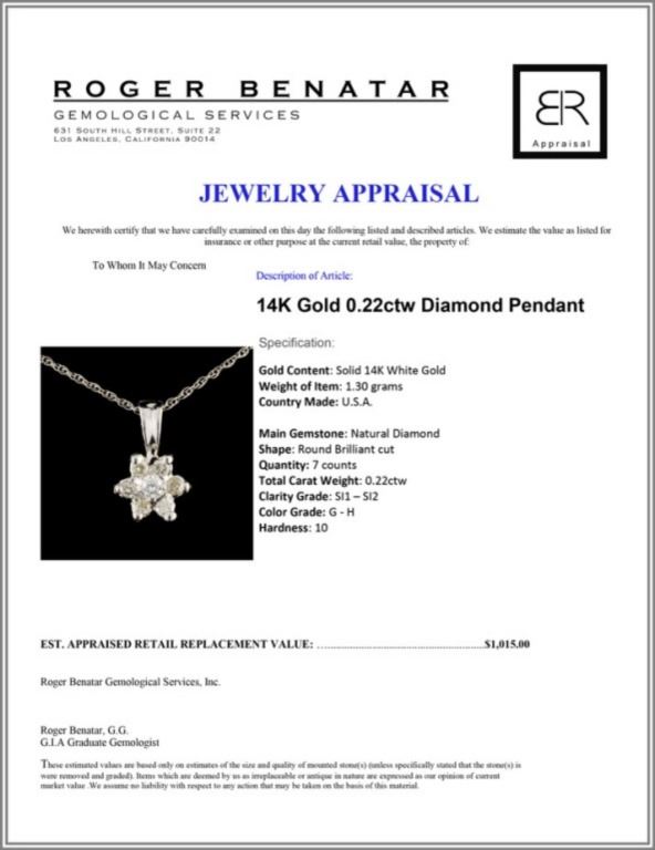 Regarding Appraised Jewelry and Loose Stones - Auctionfarm sends them out to a third party for Retail Replacement Value Appraisals, which are the most common. These types of evaluations are written for insurance needs. This would be the cost to replace the jewelry with an item of equal quality and kind, considered to be the current market price or the replacement value. This type of appraisal is done to protect you in the event of damage or loss of a valuable item. Our appraisals are conducted by independent 3rd Party appraisal firms that utilizes Certified GIA Gemologist. Appraisals should be used for verification of gemstone and/or metal weight, size, and grade only, not actual value. Appraisal value should be considered for insurance purposes only, not actual value, as price varies greatly from retail locations thru out the world. Items should not be purchased with the expectation to resell for appraisal price, or for profit.