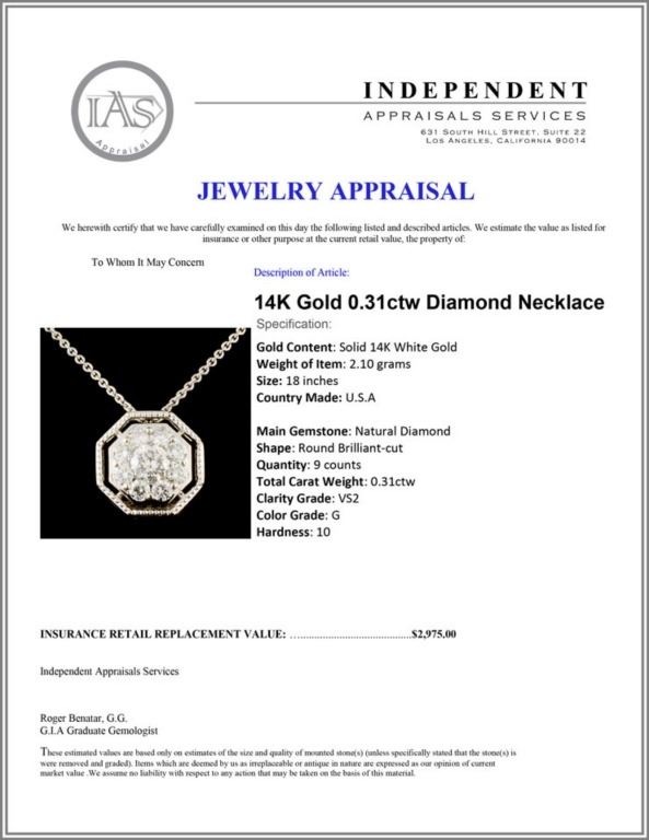 Regarding Appraised Jewelry and Loose Stones - Auctionfarm sends them out to a third party for Retail Replacement Value Appraisals, which are the most common. These types of evaluations are written for insurance needs. This would be the cost to replace the jewelry with an item of equal quality and kind, considered to be the current market price or the replacement value. This type of appraisal is done to protect you in the event of damage or loss of a valuable item. Our appraisals are conducted by independent 3rd Party appraisal firms that utilizes Certified GIA Gemologist. Appraisals should be used for verification of gemstone and/or metal weight, size, and grade only, not actual value. Appraisal value should be considered for insurance purposes only, not actual value, as price varies greatly from retail locations thru out the world. Items should not be purchased with the expectation to resell for appraisal price, or for profit.