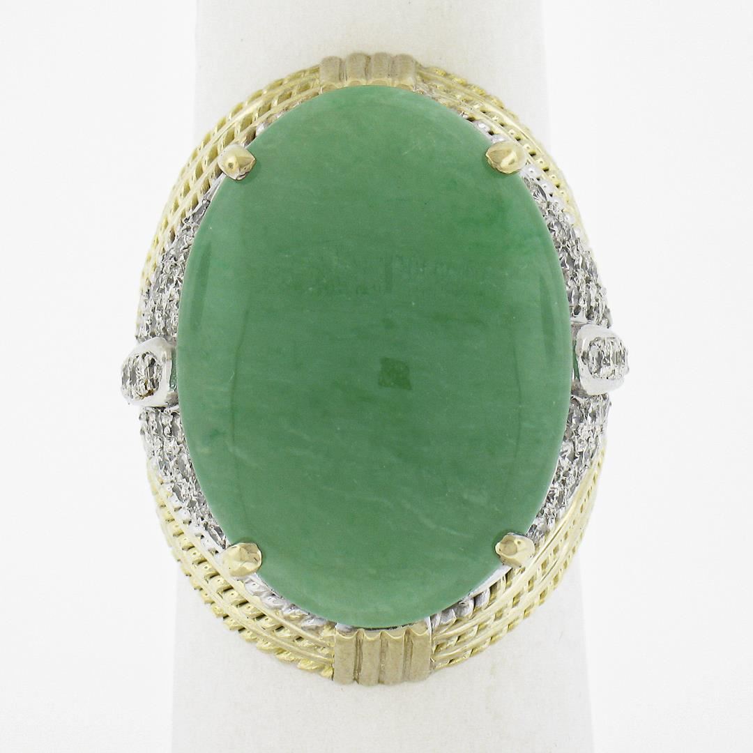A solid 14k yellow & white gold ring, with 1 oval cabochon cut natural jade (22.7x16.6mm), and 52 round cut natural diamonds (G-I - VS2-I2 ; 0.60ctw). The ring is size 7.0, weighs a total of 16.12 grams, and measures 27.1mm wide.