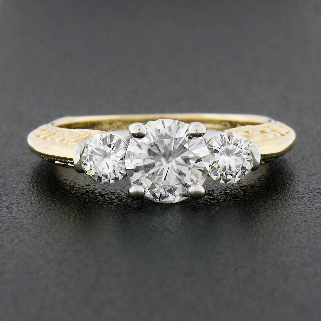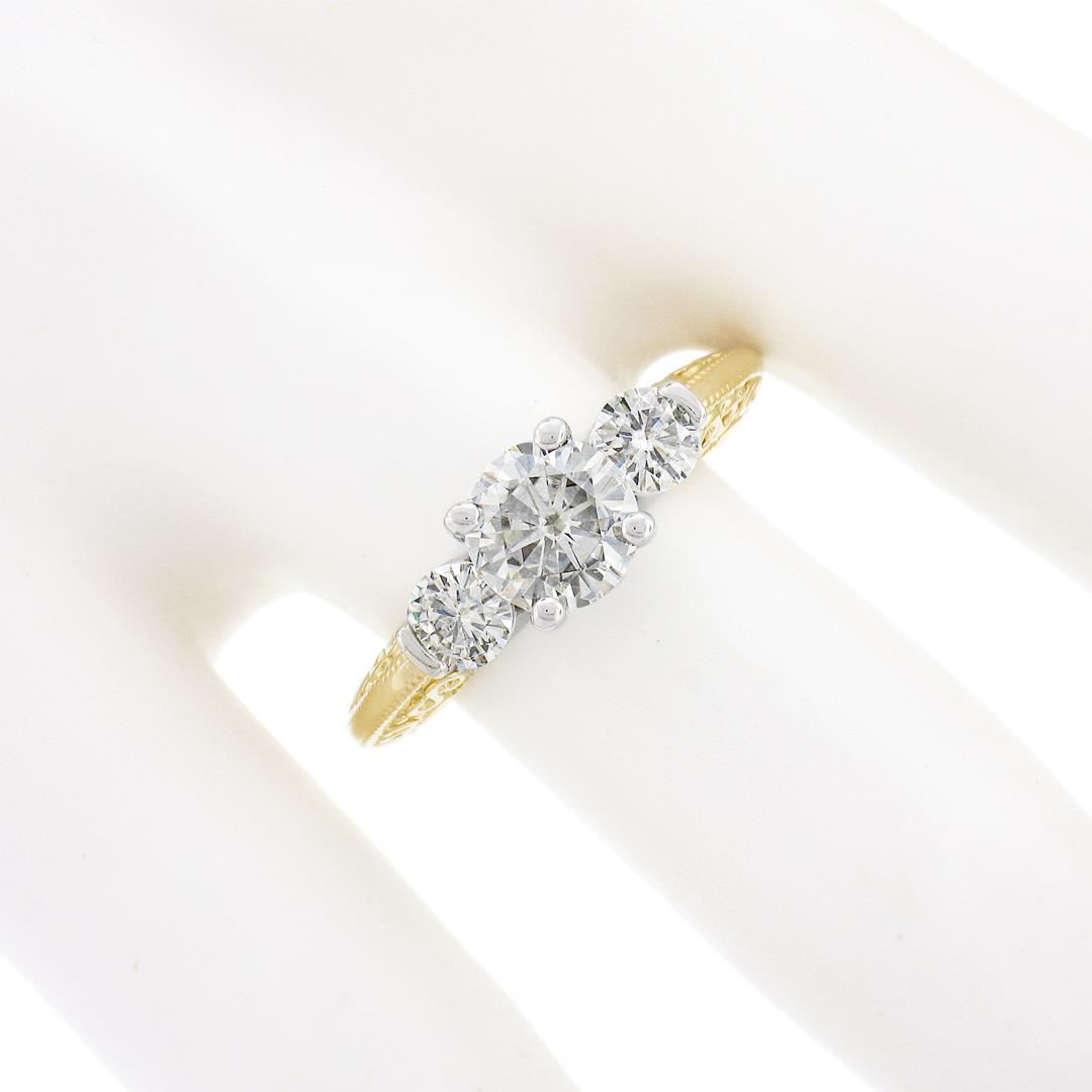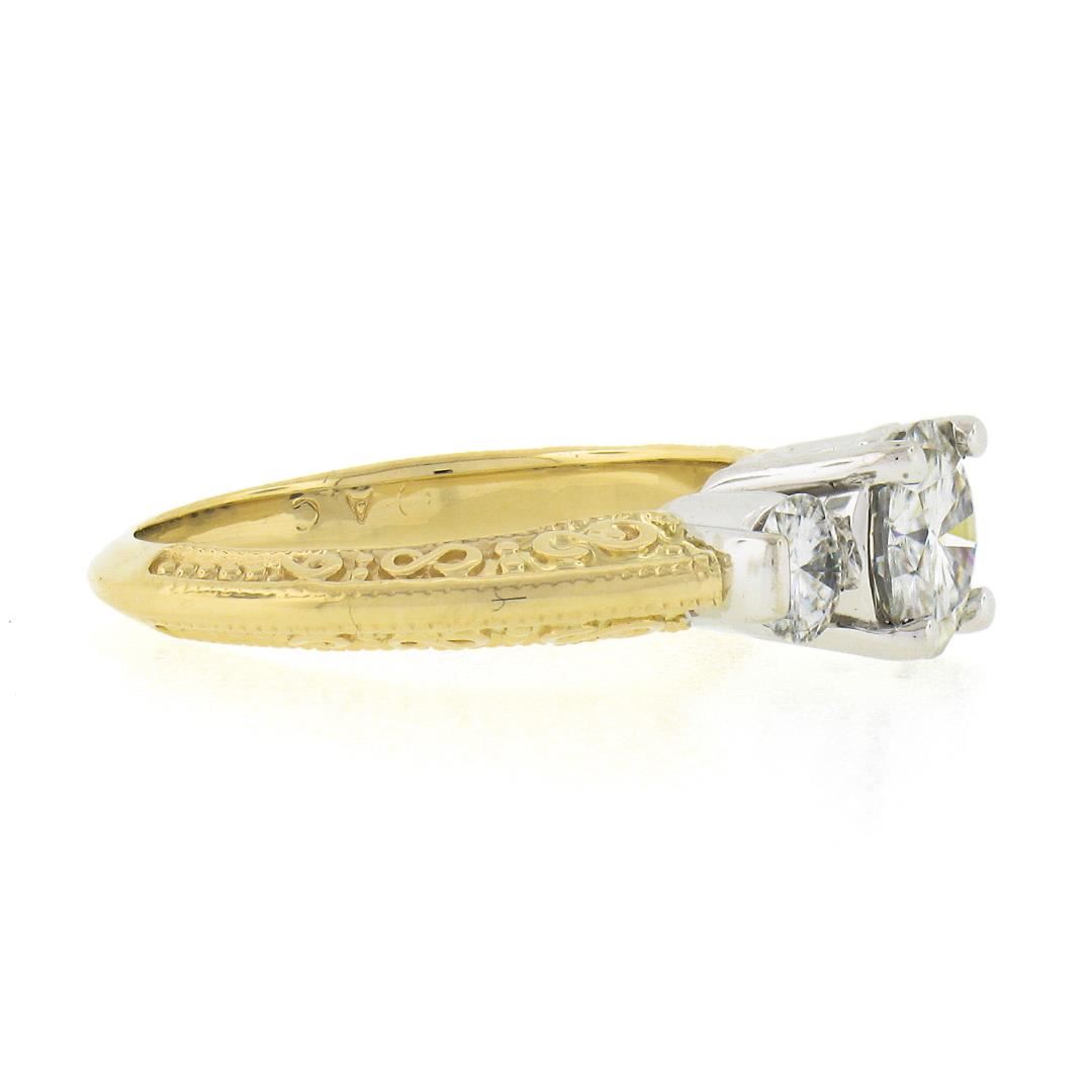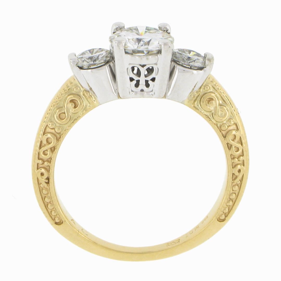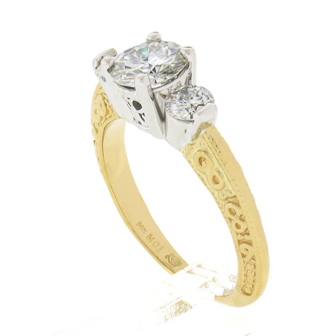 A solid 14k yellow & white gold ring, with 4 round cut synthetic moissanites. The ring is size 7.0, weighs a total of 4.81 grams, and measures 6.6mm wide.