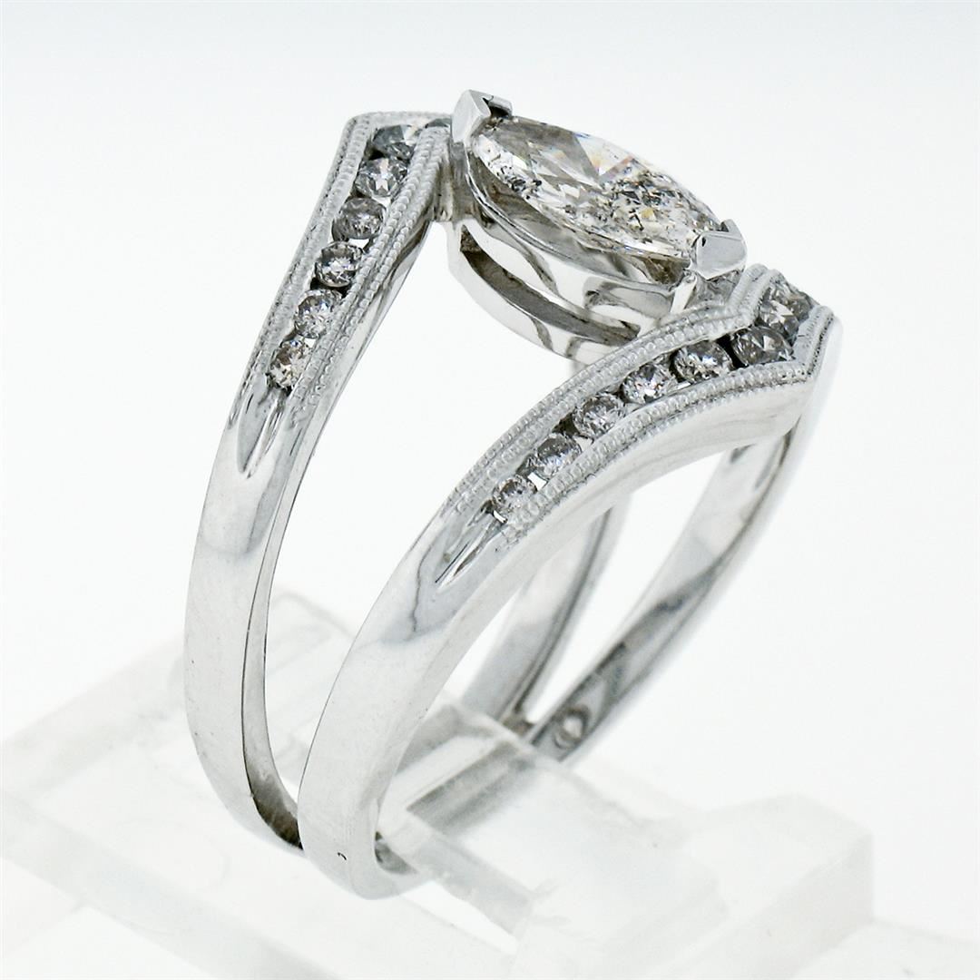 A new solid 14k white gold wide open split ring, with 1 marquise cut natural diamond (G- SI2; 0.55ct), and 22 round brilliant cut natural diamonds (G/H - SI1/SI2; 0.46ctw). The ring is size 6.5, weighs a total of 4.91 grams, and measures 15.50mm wide.