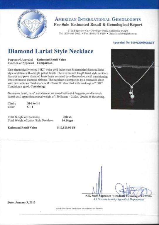 Regarding Appraised Jewelry and Loose Stones - Auctionfarm sends them out to a third party for Retail Replacement Value Appraisals, which are the most common. These types of evaluations are written for insurance needs. This would be the cost to replace the jewelry with an item of equal quality and kind, considered to be the current market price or the replacement value. This type of appraisal is done to protect you in the event of damage or loss of a valuable item. Our appraisals are conducted by independent 3rd Party appraisal firms that utilizes Certified GIA Gemologist. Appraisals should be used for verification of gemstone and/or metal weight, size, and grade only, not actual value. Appraisal value should be considered for insurance purposes only, not actual value, as price varies greatly from retail locations thru out the world. Items should not be purchased with the expectation to resell for appraisal price, or for profit.