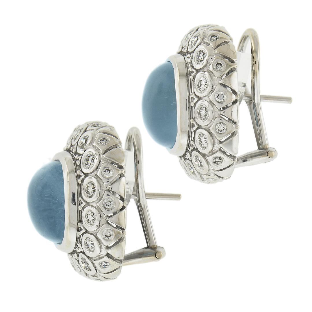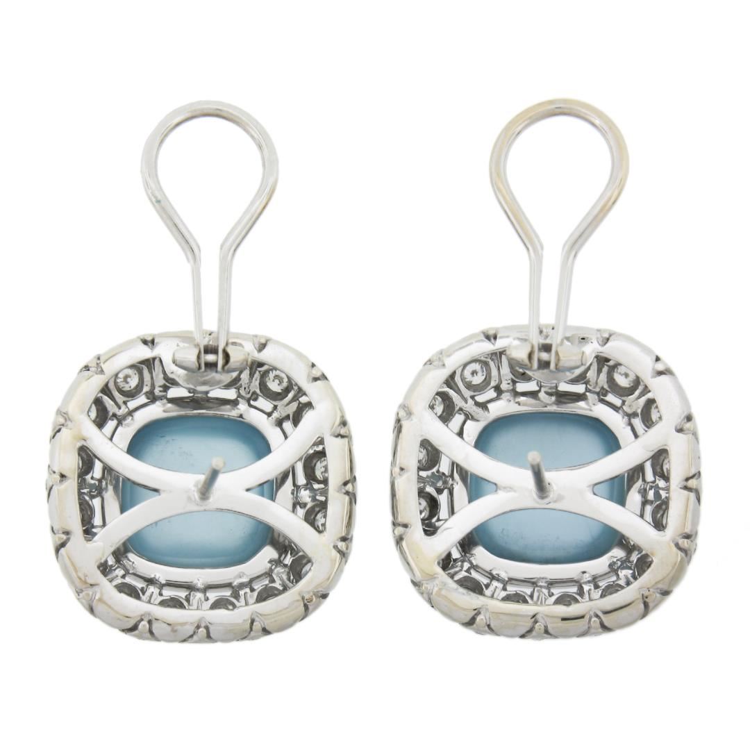 A solid 14k white gold button earrings, featuring 2 cushion cabochon natural aquamarine (12.5x12.5mm (approx.) - 18ctw), surouned with a halo of 64 round cut natural diamonds (G-I - VS1-SI1 ; 2.0ctw). The earrings measure approximately 23x22.6mm and weigh a total of 21.32 grams.